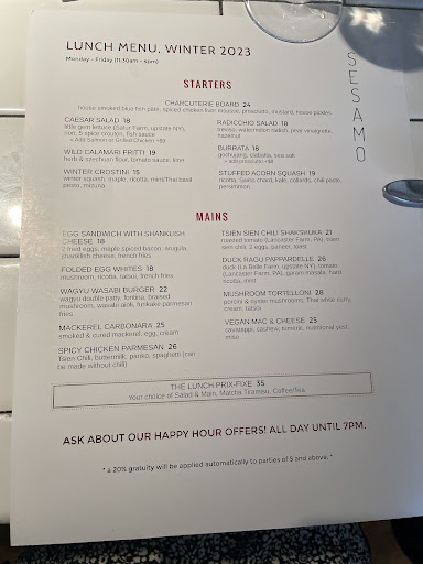 Read moreAfter seeing Sesamo on our first night in NY, we thought this would to be a great post-marathon celebration dinner. The restaurant has a creative menu and the ambience is warm and inviting. We arrived early for our 6:45 dinner, were sat quickly and provided water. After 15 minutes of waiting, we were asked about drinks and we attempted to order only to be provided with a laundry list of the dishes they were out of. The gentleman apologized for the delay and the shortage of supplies. After reconsidering our food choices, we ordered and were essentially left alone⊠No one checked on us. No one offered to refill our water. The restaurant wasnât packed and the wait staff were just at the host stand chatting save for one server who was rolling silver ware. He realized we didnât have any water, so offered to bring us water and bread. Unfortunately, he forgot the water and again we had to request it. After we received our entrees, the staff was again absent and otherwise preoccupied with talking or looking at their cellphones. Again, the restaurant wasnât busy but based on the service youâd think they were all triple sat with large parties.