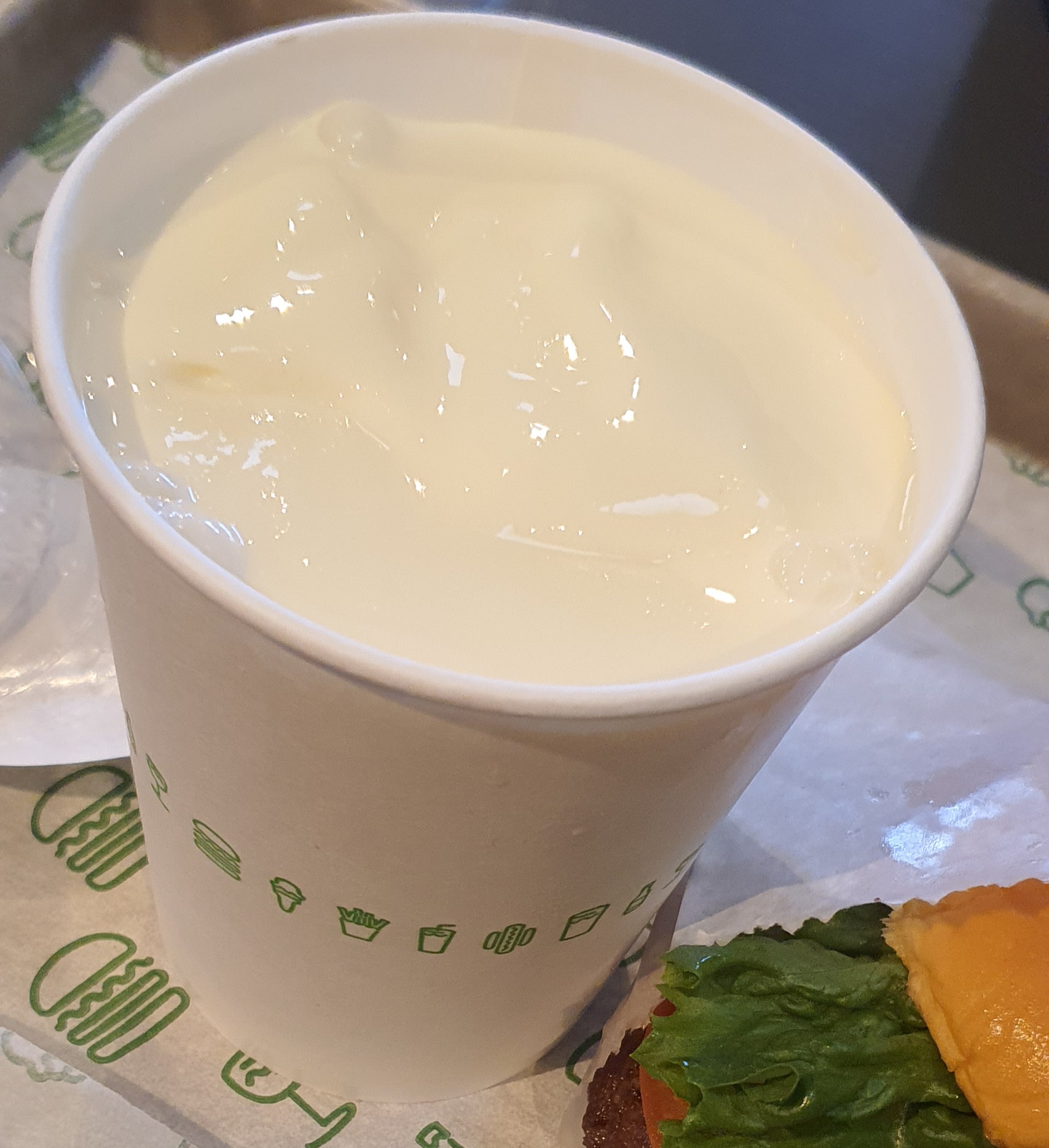 Read moreAverage food, bustling atmosphere, long lines, too few tables. No service. We had seen the one at Fulton but the lines were too long to consider. The one across from Barclays had a line but not quite as long. I truly don't get it. Despite the high volume our fries were tepid (we had two varieties for the table, both tepid and nothing special). HOW IS THAT POSSIBLE!!? they must be constantly frying - why are they not hot? Is it so people can and will gobble them quickly and leave? I had the portobello burger; it was good. Another had a cheeseburger; said it tasted like a cheeseburger: not bad but nothing to recommend it. Same type of response around the table. The chocolate shake was very chocolatey but nothing else to recommend it and the opening in lid on the shake kept collapsing the straw, flattening it so it didn't allow for drinking. Seating is so limited we split up so one could snag a table if one opened up while others stood in line to order. There were people posted all around the dining area, ready to pounce if diners moved. While seated there are others hovering to take your table. Maybe that's the key: people see the crowds and assume it's good, they are so rushed they don't even taste the lukewarm food as they wash it down to allow the next group access to repeat...