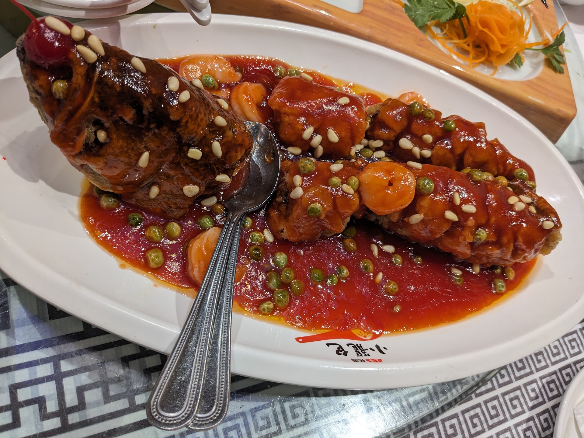 The fish was first butterflied filleted and the spine and bones discarded. The fillets themselves were then sliced into strips, while still attached to the skin. It would then appear to have been flash or deep fried (possibly in a wok in an inch of oil), causing the meat to "roll" around the skin. Turning it into an inverted fish "roll," with the crispy skin as the center, holding the crispy meat facing outwards. These two rolls were then placed behind the head, which can be seen in my photo, where it must have then received it's sweet and sour bath. Absolutely amazing.