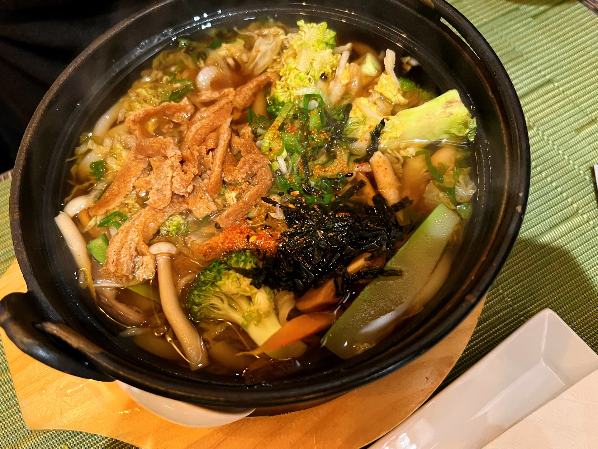 I got the tempura nabe udon ($17.95) and my friend got the vegetable nabe udon ($16.95). While I agree this is pricey for udon, I was shocked of the reasonableness of the price given the location. My friend thought the vegetable udon was good, but needed more flavor, so we asked for chili flakes. I had the opposite problem with mine. If I'm getting udon, I do not want spice. There were a noticeable amount of chili flakes in my udon, and it was a noticeable kick. I think they should advertise that on the menu, but now you know and if you also do not want a kick, make sure to make that clear to them when you order. Flavor-wise, I liked the flavor of the shrimp tempura. The batter was the right thickness and the shrimp tasted really yummy! The broth was standard for udon, noodles were chewy, and they provided a lot of "throw-away" vegetables. I would prefer a smaller amount of higher quality ingredients, but that's personal preference.