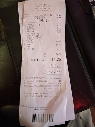 Met up with my wife on 1/18 /23 at about 6pm for dinner near our new apartment .The bar crowded/lively on Wednesday evening though almost all the tables in the back area were empty... front and back hostess stands both empty...asked for a table for 2 for dinner to the confused younger man after we walked to the deserted back of the restaurant . he pointed to a table for 4 and said he couldn't seat us there (we asked for a table for 2 not 4) ...We pointed to the empty table for 2 in the back (almost all the tables were empty regardless) & he looked perplexed and then went and spoke to the bartender for a good 2-3 minutes(can not imagine what they were talking about but kept looking over at us. ) .The bartender then shook her head no disapprovingly as she looked over at us again (?!...Bizarre., maybe they didn't want anyone older than 20s/30s... i have no idea ,we were simply meeting there after work. My wife was very upset at how we were treated and she is extremely laid back. .Honestly, this was the Worst experience we have ever had in a restaurant and we eat out multiple times per week x 20 years). We recently moved to the neighborhood and eat out/order out most nights --have already taken out from Side door (food mediocre but we liked the idea of supporting our neighborhood sports bar and figured we would try eating in) .BTW we were also going to take back another 2 meals for our kids that eve , Anyway ,we walked out bewildered and decided to walk for a minute as we were both upset ..walked over to try a new place to us, Yara--excellent place with live music om 53rd and 2nd (a little pricier but when we did takeout from sidedoor a few weeks earlier , the salad with protein cost 25$ so Yara wasnt much of a stretch in price but big difference in quality and atmosphere ). Anyway, given that Side Door is within steps from our apartment...and we eat out a lot as a family and with groups of friends ..this incident will cost side door a good of amount of business indefinitely. Never...