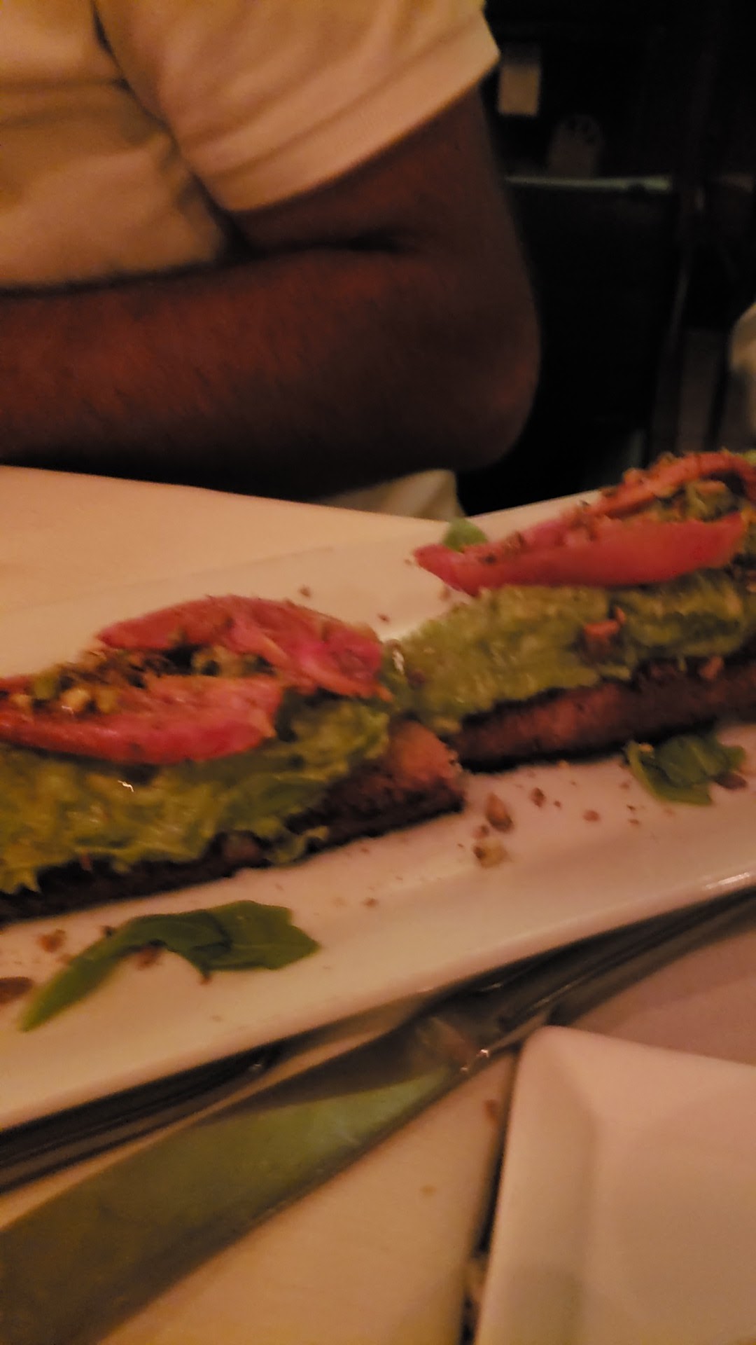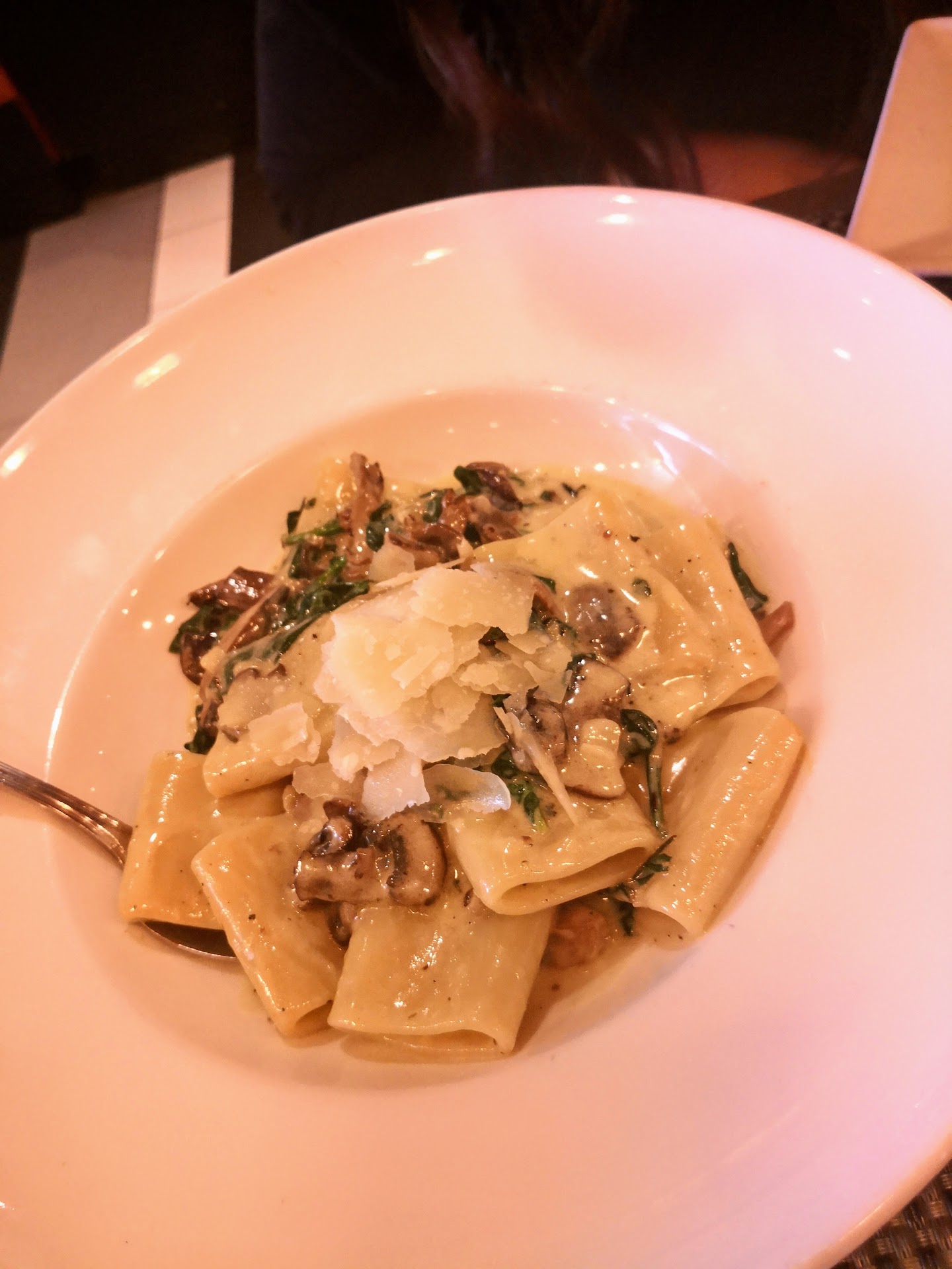 We ordered family style, got eggplant rolatini, hen of the woods (grilled mushrooms topped with parmesan and pesto), and the mushroom salad (more of arugula topped with charred mushrooms and farro). We also got two pizzas, the dough of which was very impressive and made me think what kind of oven they have back there. We got Margherita and, you guessed it, more mushroom and goat cheese (which was excellent, and topped with truffle oil). The tuna steak came with a peppercorn crust and red wine glaze that was excellent, even good well done. Branzino was very good as well. The fettuccine Limone was good, reminiscent of Lil Frankie's, but with some kind of green mixed in. Overall a heavy emphasis on mushrooms, but we didn't mind.
