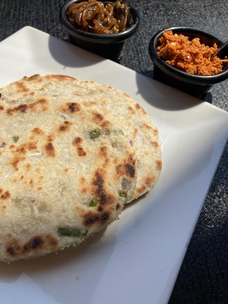the Aapas— which is more of a shareable side dish are great. bowl-shaped pancakes served with either a onion sambol or coconut sambol. i like ordering these with any of the curry dishes and dipping pieces of the pancake in or just pour a little bit of the curry in the whole pancake.