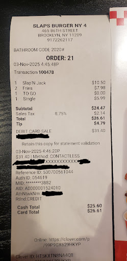 Read moreAs you enter in a well kept space, you will smell grease and oil. After I left, my hair smelled as if I was making the burgers. I ordered a Slap N Jack ($10.50) with a side of small fries ($3.99) and a Single burger ($5.99) with a side of small fries ($3.99). After I paid, I realized there was a tip of $4.79 added. The male cashier took our order. After I left with my order, I realized the Single burger was missing so I went back. I spoke to the female cashier with curly hair and light colored eyes and my burger was received. There were no apologies or any attempt to recover from the mishap. The burgers were okay and smaller in size. The French fries were all soggy. I saw an eyelash hair on the top of the burger container and blew it off thinking it could've been my own until I saw another hair inside of the container. For all of these above, I will not...