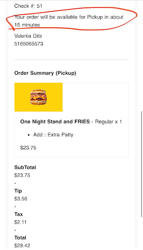 P.S. Your employee also gaslit me! When FINALLY handing me my order, which included an extra patty (for which I PAID while ordering online), she insisted that you don’t even make double-patty burgers and that she added it as an exception, even though that option clearly exists on your website and I paid $7 for it! Also she asked me “to show respect” !!!!! Apparently demanding a service to be provided and asking questions about an order you paid for considered “disrespectful” ……….. Unfortunately, I was shown ZERO respect from the very beginning at...