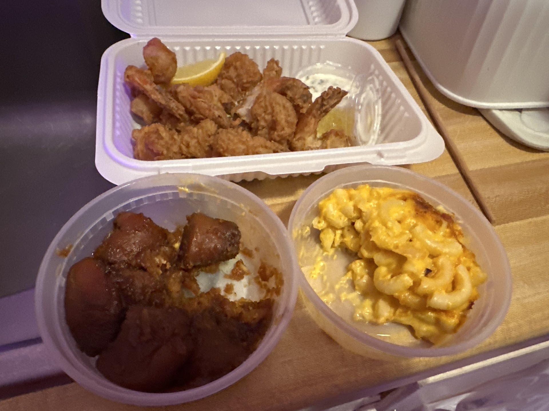 The fried shrimp tasted alarmingly off. They were soft and had a spoiled taste, suggesting they had been left sitting for far too long. Fresh seafood has a certain bounce and crispness, and this sadly missed the mark entirely. The macaroni and cheese was even more underwhelming; it had the consistency of processed Velveeta and lacked any of the creamy, homemade appeal one would hope for. Lastly, the candied yams were a sugary, hard mess, with no tenderness or balance in flavor—just cloying sweetness and an unpleasant texture.
