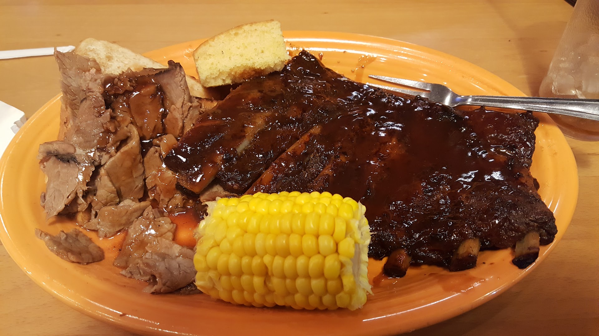 The taste of food was lacking. Zero smoke flavor as I stated before. The corn was literally just boiled in water. It had no seasonings or salt and not even at least buttered once out of the pot. the portion on that was also a joke. I had not maybe half a corn. I wasn't worth a full corn. I guess I needed to pay them $60 for a full corn on the cob. I have gone to fast food chains like Texas Chicken & Burgers and received a bigger corn on the cob and seasoned at that. The corn bread was tiny. The meat had no flavor without the sauce and the sauce was just sweet with no real flavor to it at all. The potato salad was oddly tangy and also lacking flavor. This restaurant's show of good Southern smoked foods is disgraceful.