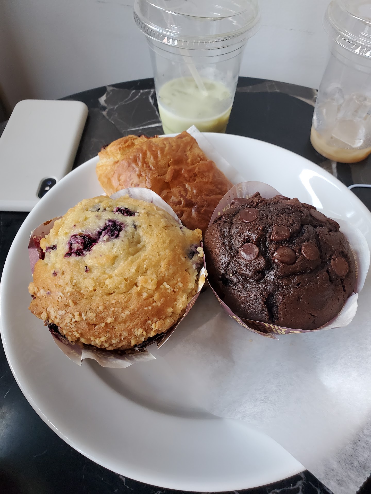 The almond croissant folded almost in half with the force of its journey into the bag. The muffin was shoved into a small bag upside down and then sent after the croissant, it seemed. The top stuck to the small bag and came away entirely when the muffin was removed, a feat made more difficult by the bent sides of the muffin, which doubtless happened during its transformation into a projectile. The little white paper bag seemed to enjoy the pastry at least. I'm glad someone got to do so. The chocolate croissant seemed to be bolstered by its rather stouter filling and survived its travels from case to oven to bag.