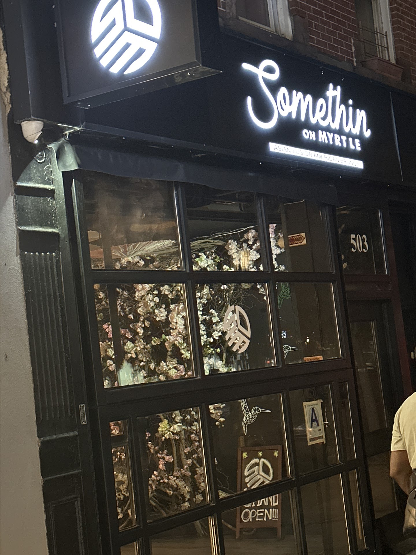 Somethin’ on Myrtle is an asian fusion restaurant that provides everything from vibes to libations. For our appetizers, we ordered the catfish & lobster bites. The server explained that they were out of lobster but offered us salmon & shrimp bites. We received the salmon but the shrimp was missing lol. The salmon wasn’t overly seasoned, it was fresh & tasty and it was served with 3 different house sauces (soy/sesame sauce, creamy scotch bonnet sauce and sriracha aioli sauce). We also ordered the Maryland style crab cakes in which we had to return because they were cold. When we received the second batch, the crab cakes were still cold. Feels like the crab cakes are made in advanced and sat prior to being served. We told the server and we were told that we would get complimentary drinks but I don’t believe that happened.