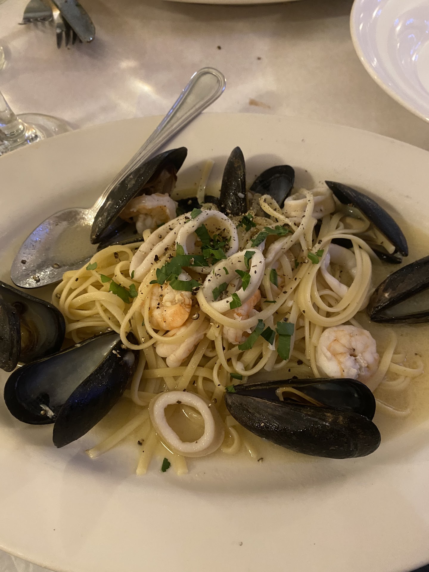 Once our friend arrived we order appetisers; calamari, bruschetta and the meatballs. The calamari was a little underwhelming but the other 2 dishes were good. For main courses 2 of us ordered the seafood linguine (one in white sauce and one in red sauce) and my other half ordered the spaghetti rustici with chicken. My linguine in white sauce was a little under seasoned but the pasta was cooked well. My other half loved his spaghetti though, he actually said it was the best pasta dish he has had so far in NYC.