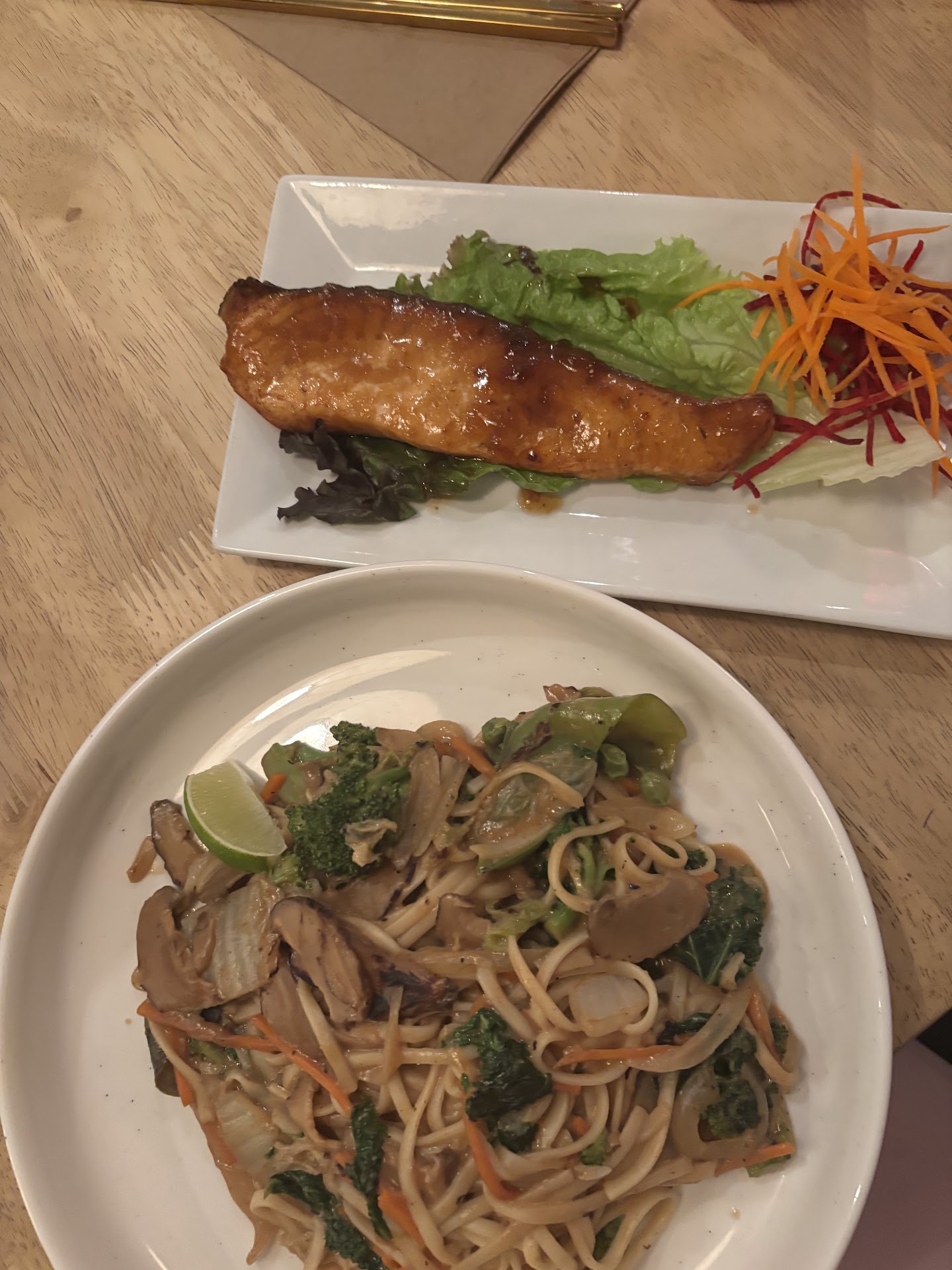 Read moreI had a delicious meal here (and ended with a bad dessert) I ordered the pad Thai and ginger salmon. The pad Thai was creamy and deeply flavorful. The veggies had the perfect bite while being soft and blending well with the pasta and the peanut sauce was very balanced. I’d give this dish an 8.3. The salmon was great as well but did have a slightly fishy flavor and I felt like the sauce was just put on top after rather than cooked in - 6.8. For dessert I ordered the chocolate mousse and I just did not enjoy it. There was no depth in flavor and the texture was weird. 5.1. I still desired a sweet treat so I got the blueberry chocolate chip muffin (I thought it sounded like an interesting combination) and it was the worst muffin I have ever had. Truly. It was gluten free like all their desserts and it fell apart immediately, was just so crumbly in the worst way - 3.2. The service was amazing (they even took the mousse off my bill) and it was a very nice atmosphere with great vibes! Even though I had a mixed experience, I will...