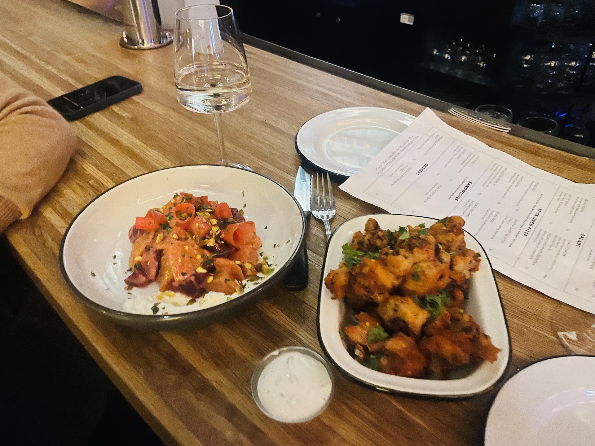 The pizza, beets salad and wings were delicious. The crust of the pizza was chewy with the right type of cheese, and it came out piping hot. The artichoke dip did not. It came out lukewarm and even though we sent it back, it still came back just barely warm.