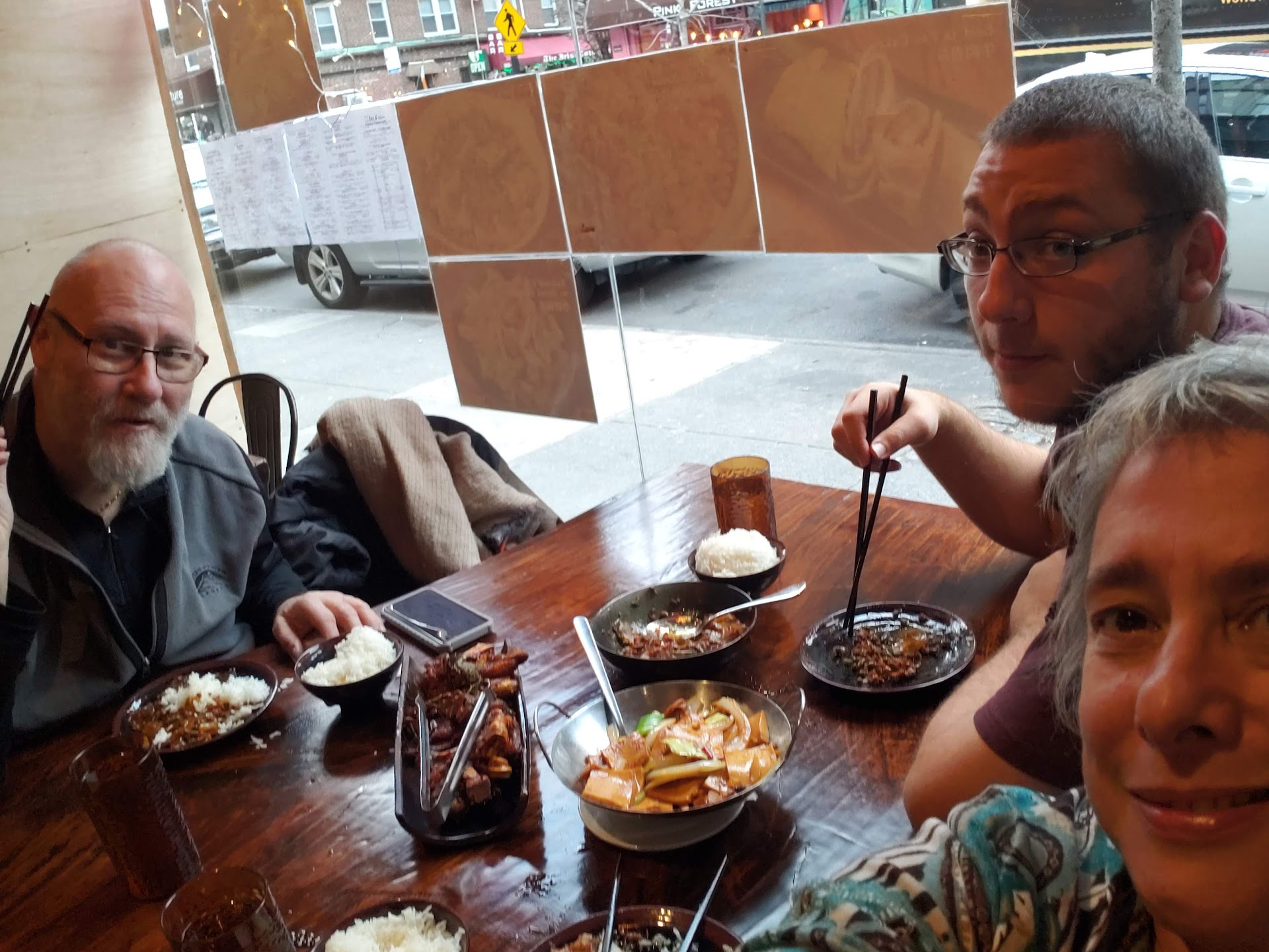 Anyway, our son B, whose first food ever was chocolate mousse and who has been enjoying dishes like clams in black sauce and south Asian oyster omelets since early childhood, is visiting from Northern California and we finally ventured over to Spy C Cuisine on Austin Street in Forest Hills, for lunch yesterday...lunch specials seemed pedestrian, so we ordered from the regular menu and just followed our gut ...it helped to look at the photos on the wall too, reminiscent of the anglicized lists in authentic flushing and downtown chinatown hole in the walls but a bit more refined and stylized .