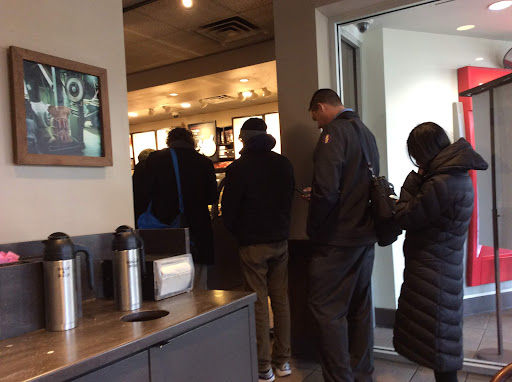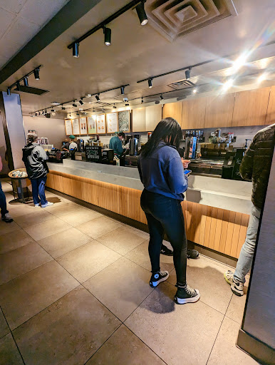 Read moreAfter a doctor appointment at New York/Presbyterian Hospital, a huge multi- building, multi-blocks complex nearby, I headed to this Starbucks at 168th and Broadway in Manhattan. Immediately upon entering the front door I noticed there was a very long line and only one cashier. I glanced around the place to see if there was anywhere I might sit for a coffee, and saw an area up front that had three small tables and a few high stools directly in front of the street side window, where there is no view of anything but traffic and scaffolding. There was also a narrow seating area in the very back which had just two tables.
