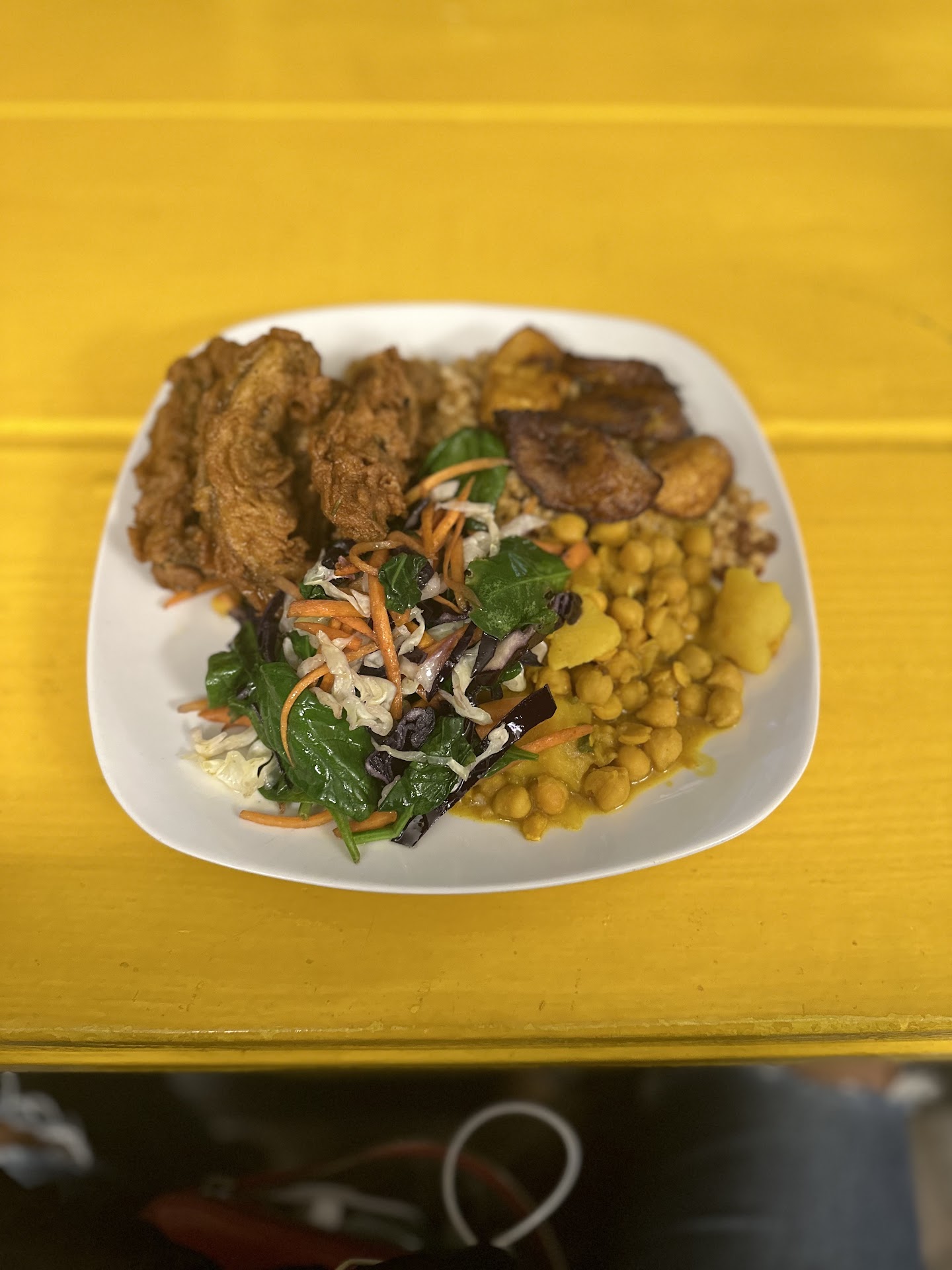 My recent visit to Starving Vegan was nothing short of delightful. As someone who doesn't strictly adhere to a vegan diet, I was both intrigued and pleased by the range and depth of flavors presented in their dishes. I opted for the large fried mushroom dinner, a generously portioned dish that allowed me to choose four sides. My selections included rice and peas, fried plantain, steam mixed veggies, and chickpeas & chana. Each component was a testament to the chef's ability to season food perfectlyâevery bite was rich in flavor without being overwhelmingly salty.
