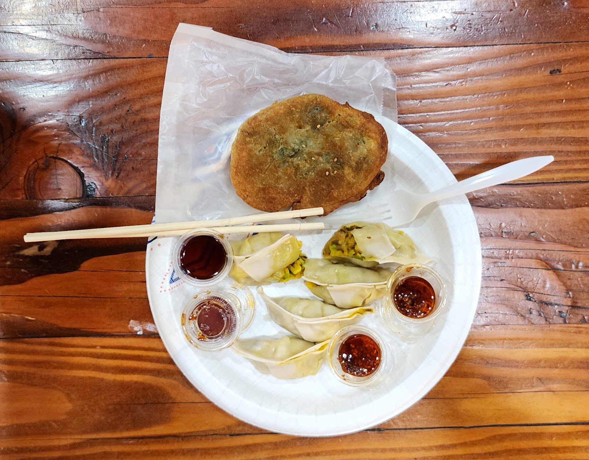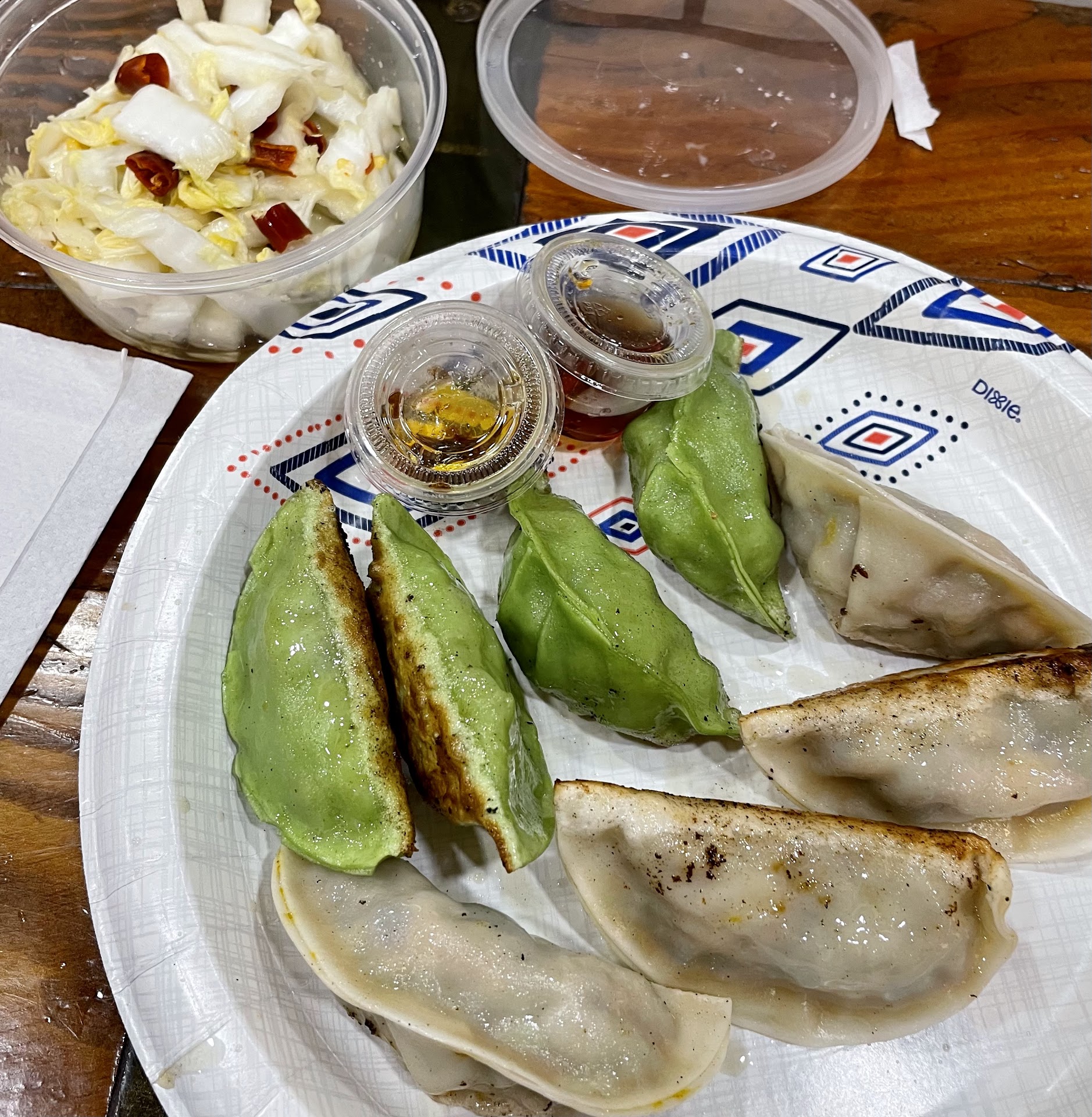 There are currently three choices of dumplings: pork, shrimp and veggies; turkey with veggies or just vegetables. Look at the menu for specifics. You can get them steamed or pan fried. There are three options of number of dumplings: 4, 6 or 8. There are other dishes such as scallion pancakes, egg rolls and pickled napa cabbages. Prices are reasonable.