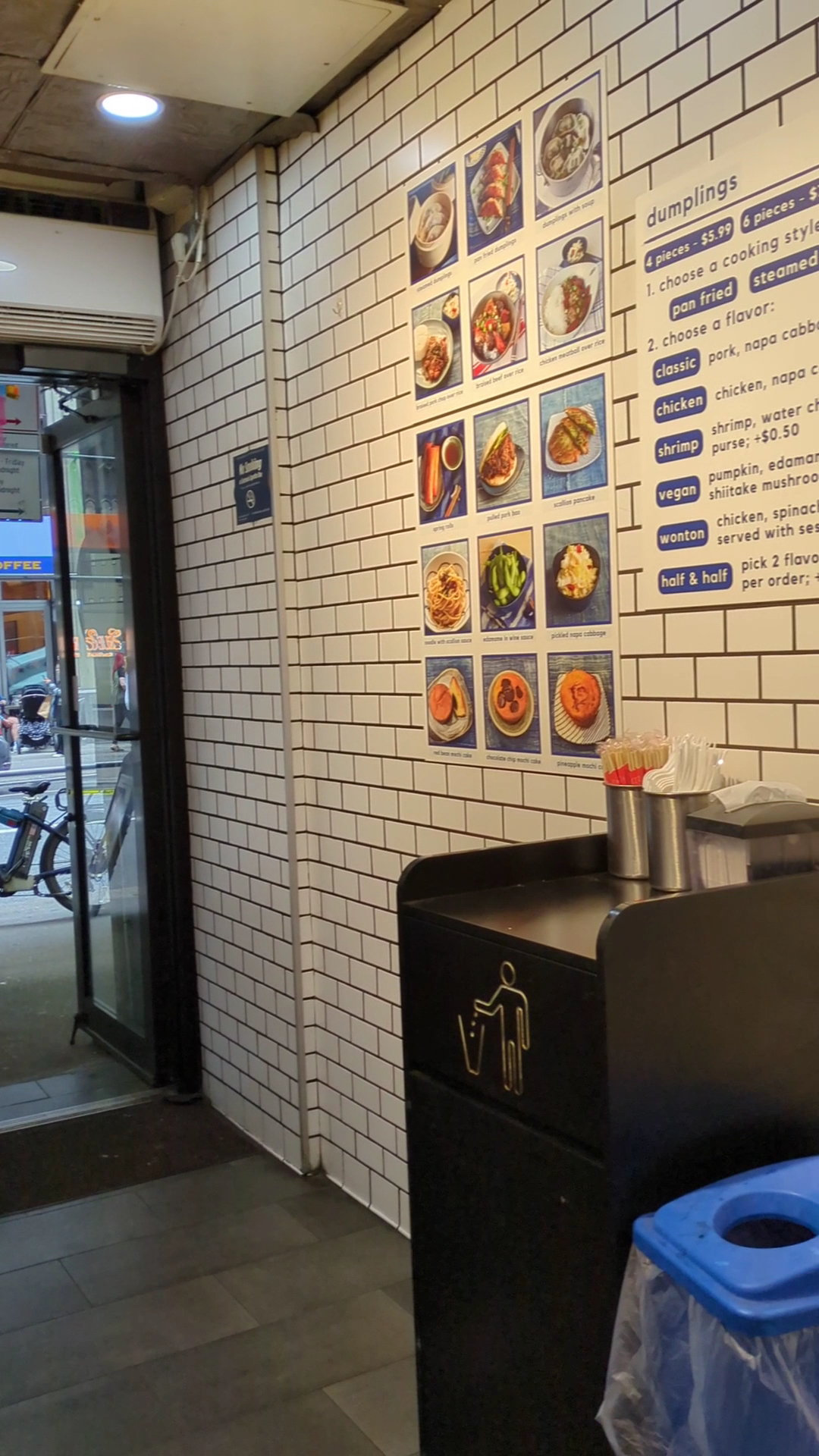 Probably the best quick bite in the area - I come here (the herald square Times Square black hole tornado) often for rehearsals and always end up going to a dumb place like pret for a quick meal and I end up having to spend a dumb 15-20 bucks to fill my dumb stomach with food that shouldn't cost that much. Glad I realized this place exists! The vegan dumplings for one were a cool new flavor for me - pumpkin with edamame and corn. Makes for very good texture. The chicken dumplings were more of the flavor I'm used to but in the end I liked the veggie ones for their novelty and texture. The dumplings come with two sauces - a vinegar and a chili oil and honestly I could drink a bowl of each (this is me suggesting bigger sauce containers for easier dunking and more sauce). I also got the pickled Napa cabbage which was a little too sweet for me - there are huge chilis in it as well but somehow they weren't spicy. The crispness and texture was a good pairing with the dumplings though. Will definitely come back to try the pork and shrimp dumplings, the pork buns, and maybe some of their specials. When I was there they also had chicken wontons with a special sauce, and a noodle dish. There's a good amount stools inside for dine-in - perfect if you're eating alone or with one other person. Wasn't busy when I was there around 5:30p - certainly not as busy as the places on the avenues. The guy working the place was also...