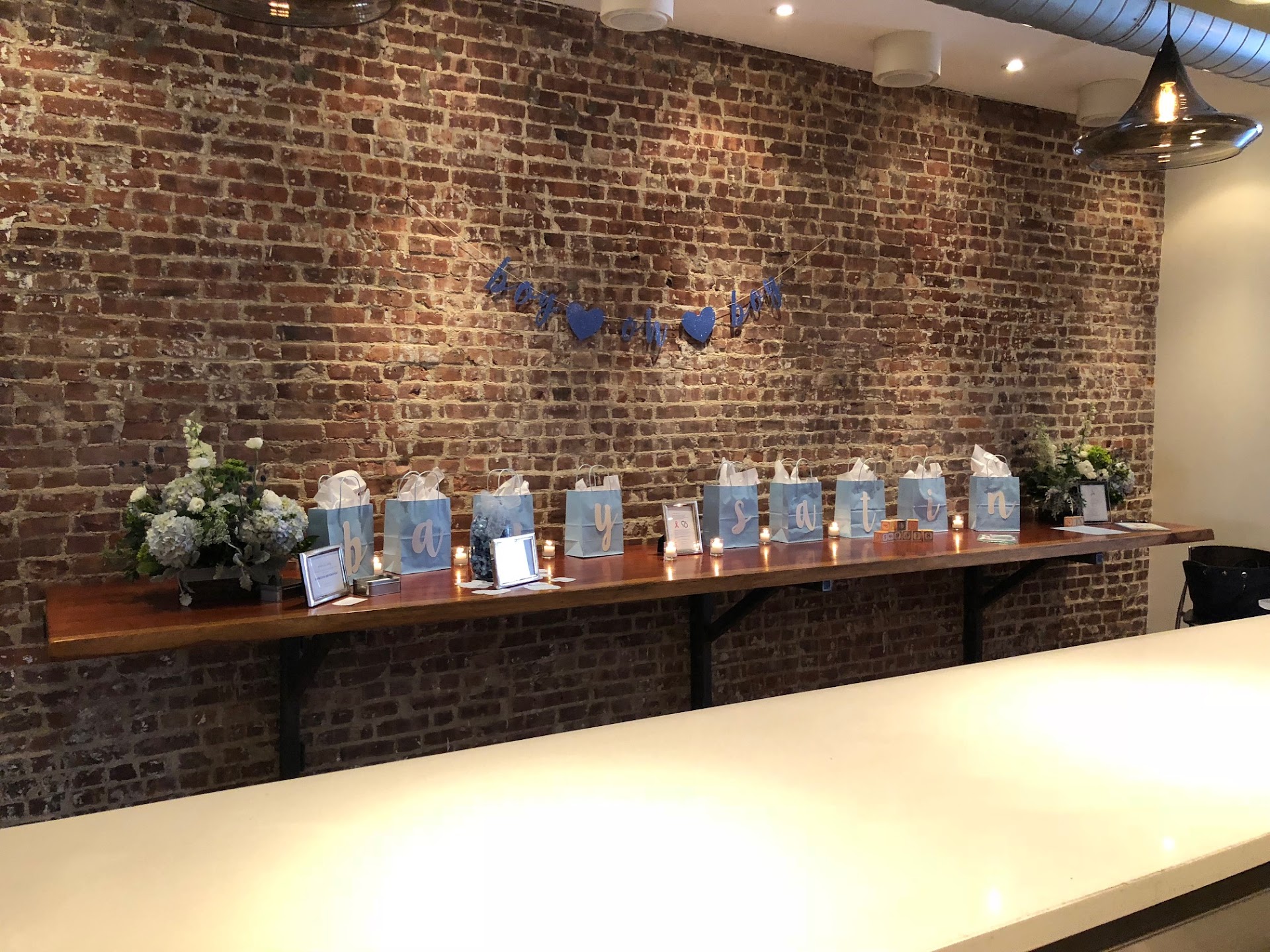 When we arrived about an hour before the start of the Shower, there was very little for us to do besides look everything over and enjoy! They know how to set up their space to perfection. It was like a mini-wedding. Starting with the personalized chalkboard which was a nice touch and also a smart way to guide people to the event space. It's not hard to find but it's always nice for guests. The space is classy, classic, and fun with the exposed brick, candles everywhere (!!) and cocktail tables set up near the front with the gift table. The bar was so cool. No detail was overlooked with the bar menu matching our decorations, specially printed for our group with "Oh Baby!" written on top. The food menus were personalized to my sister as well. The table settings were stunning and matched our blue color theme. All of this was done by The Stone Park Café team. Working with them was like having a personal event coordinator/party planner. No attention to detail was sparred.