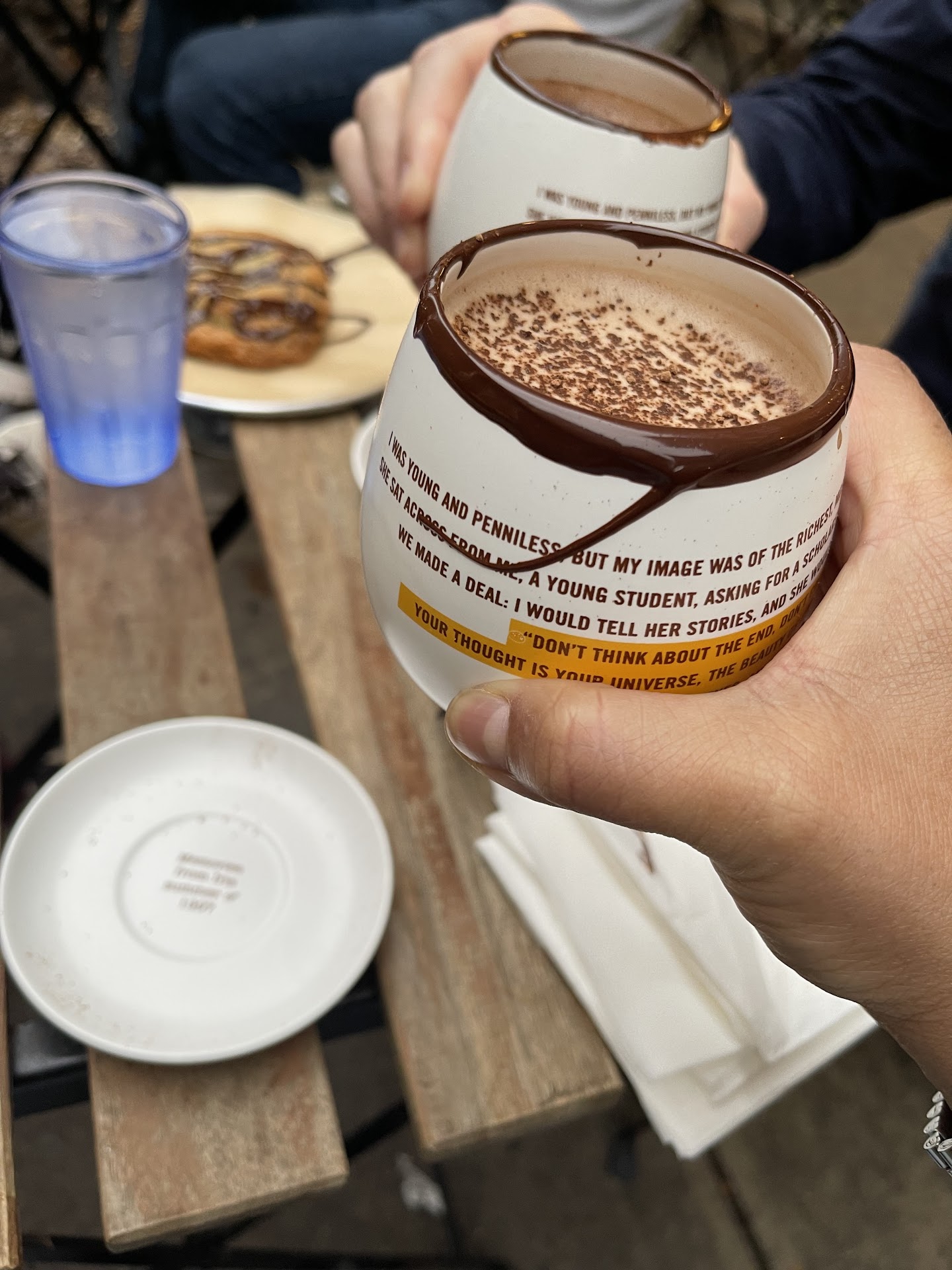 Read moreAn adorable coffee shop we stumbled upon after perusing at the Holiday Market. It was a warm winter day and decided to have our cocoa fix here. The front of the store has large windows and a designated table with outlets encouraging patrons to bring their laptops to study, write, etc. The cafe is catered to patrons who want to enjoy a coffee and dessert to catch up with a friend. We drank our cocoa outside because the inside seating was packed, and it was such a warm day, it merited outdoor seating. My BF and I ordered the hot cocoa with dark chocolate and a chocolate chip cookie. They put a rim of chocolate on the cup, which is an added flare to the drink, but for warned, you will get melted chocolate on your lips. The chocolate was delicious, but it could have been warmer and less milky. I would have enjoyed a little bit more chocolate flavor since I did choose the 70% dark chocolate, but overall, I enjoyed my drink. I like the round cups it comes with and is instagrammable. A chocolate drizzled on the cookie I could do without. I like cookies as is, so make sure to let them know your preferences. Overall, a cute coffee place near...