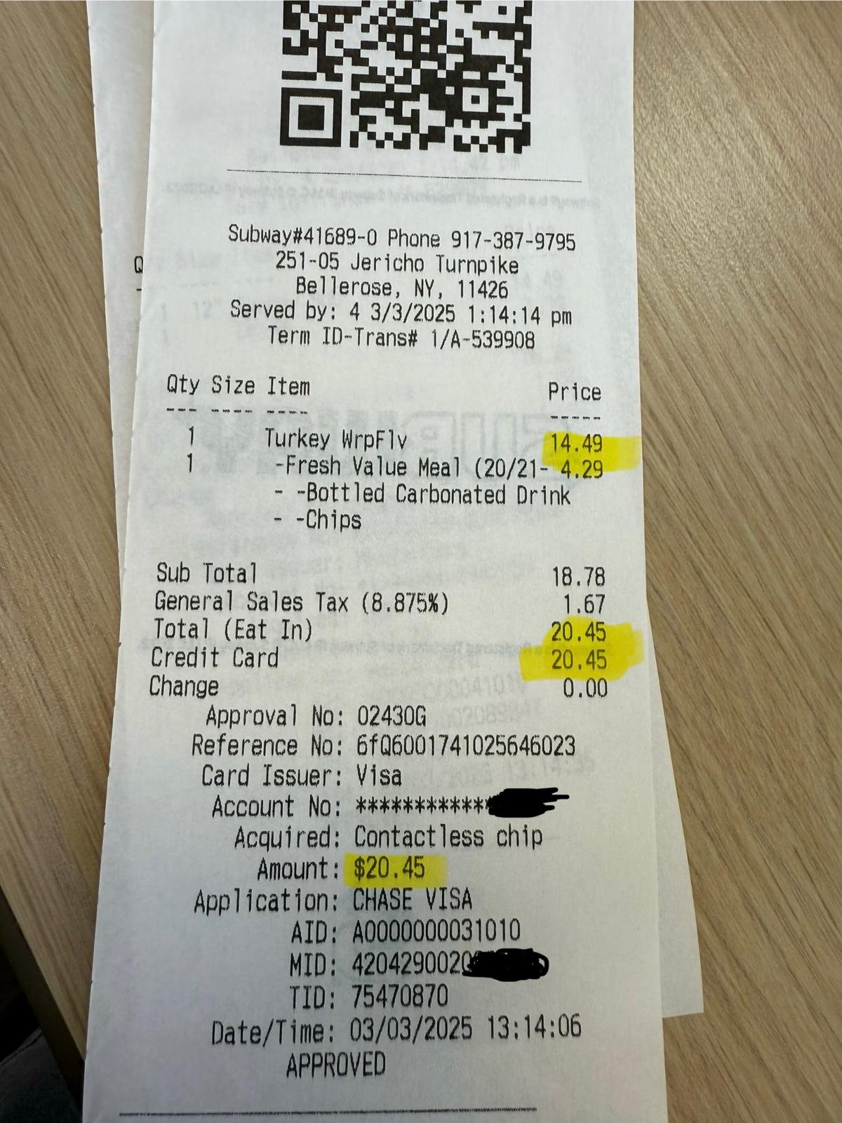 staff is great. this is one of the cleanest subways out there. And its almost impossible to find a clean subway. BUT THE PRICES ARE INSANE!!! a 12" sub with a drink and chips is $20.45. And this specific location raises its price every single month. I come here at least 2-3 a month and every time i come the price goes up. literally unbelievable to pay 20$ for a subway sandwich. that's what i call taking advantage of inflation.