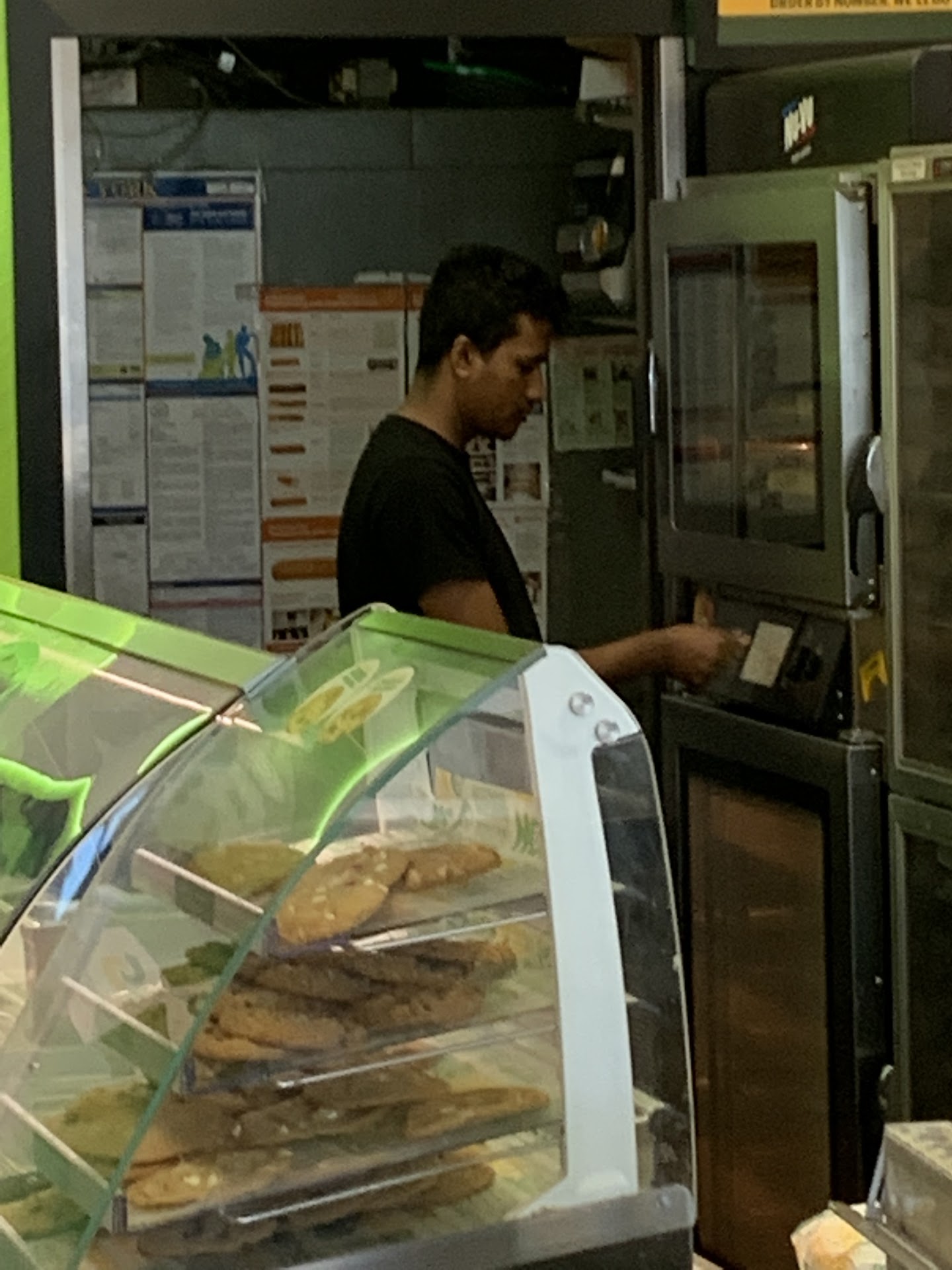 Arrived at 8:45 on a Sunday, more than an hour before the listed closing time. Door was locked. I could see the employee behind the counter (short woman, black hair), so I knocked. We made eye contact, I signaled her to open the door, but she ignored me and disappeared to the back. I left to another nearby Subway, that one was also locked before the closing time.
