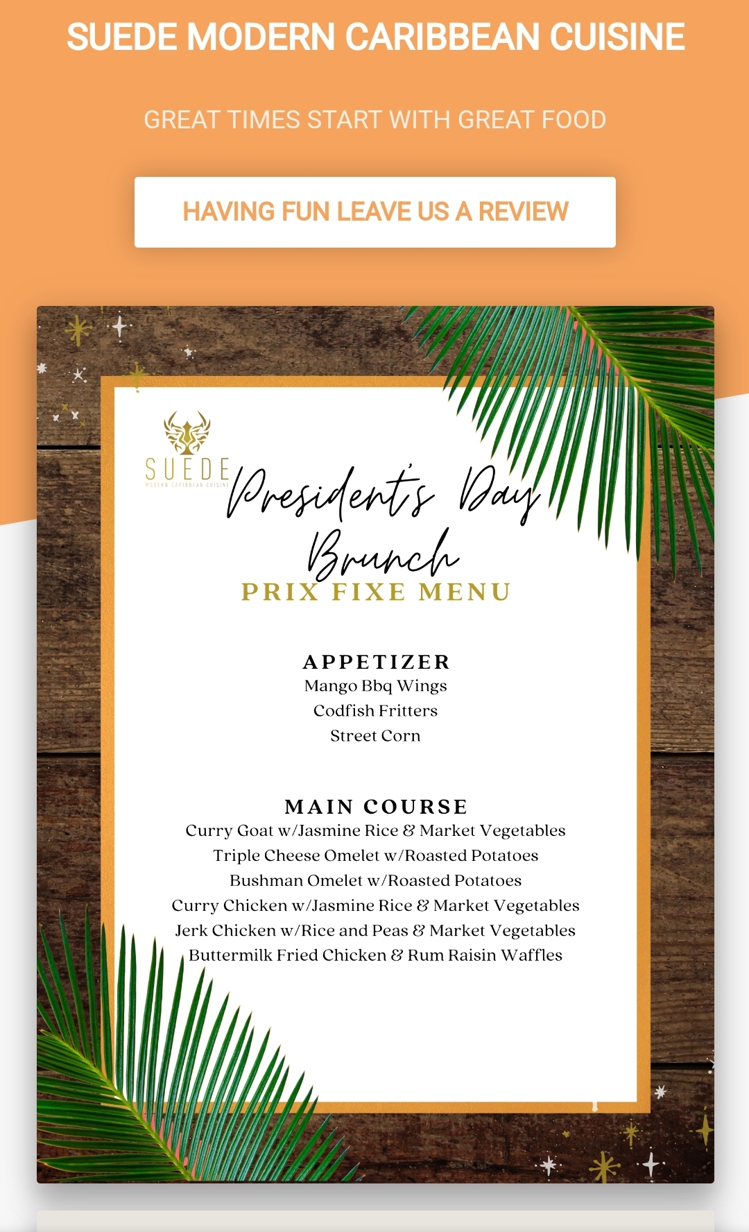 5 years ago - 5 STARS: My experience is always great a Suede! The chef is great food is always favored well. I had the seafood roti and it was awesome! I came here on numerous occasions and decided to attend for my bday and at first they were not able to offer the free meal for option, bc it was a day or time that was excluded but the manager came over explained his apologies. I said no worries it's ok and later on that night he came back to check on us and said he will offer it. It made the night even better to get a free delicious meal! I went there yesterday for a bday dinner and we sat outside and it was awesome. Great