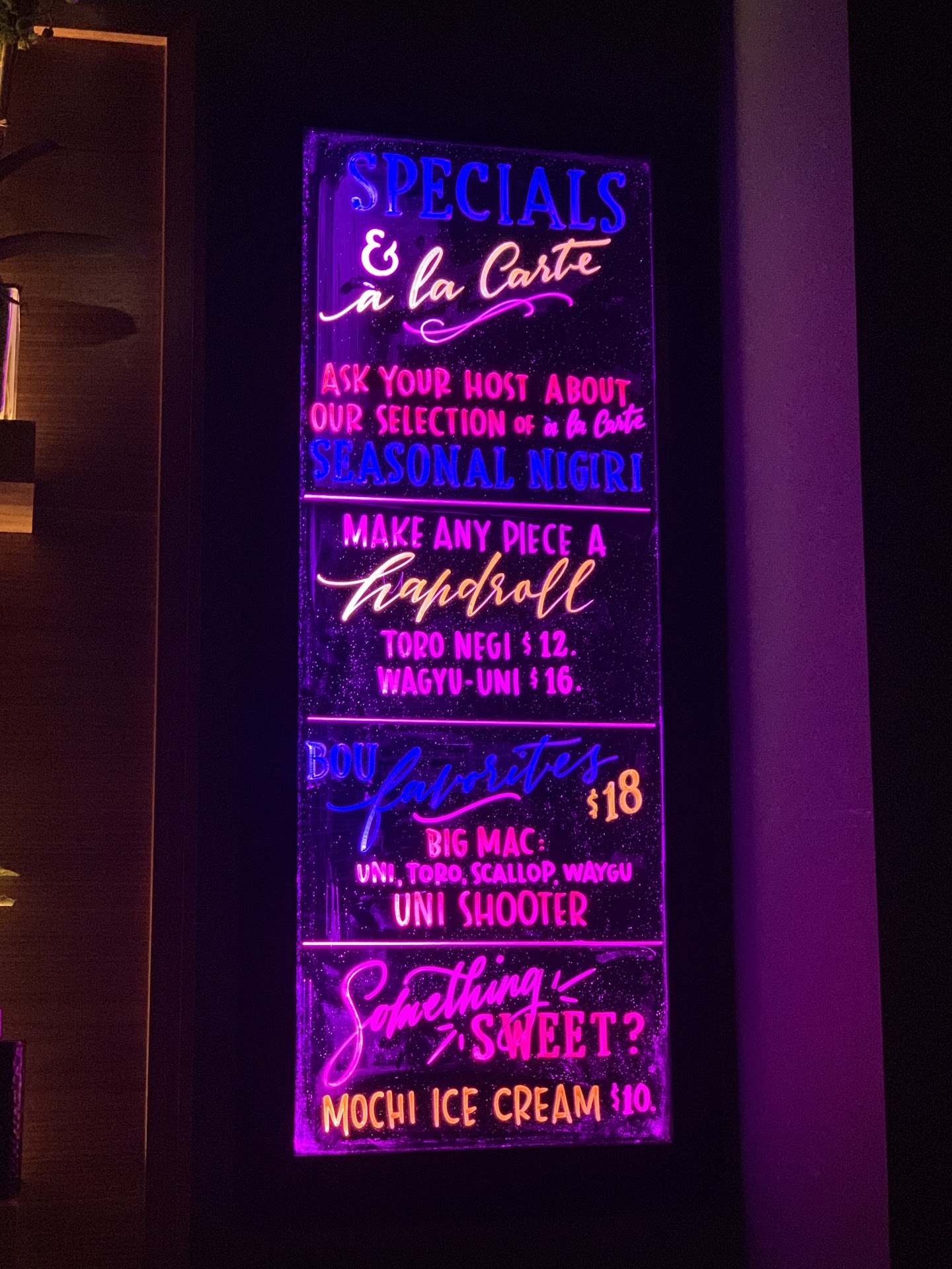 Once sat, I was taken care of by the amazing Obrey, the Omakase Chef, and we chatted the whole night in Spanglish. I did the 12-course Omakase and here are a few standouts: Salmon roe was so sweet and briny (ended up ordering an extra) Chopped tuna - seriously wow (yup, extra of this one too) The scallop was so soft and tender and the wasabi is strong but not overpowering The toro will blow your mind. The truffle shavings are the perfect touch. (Yup- twice on this one too) Bbq eel - was warm almost hot, sweet and savory- just woww