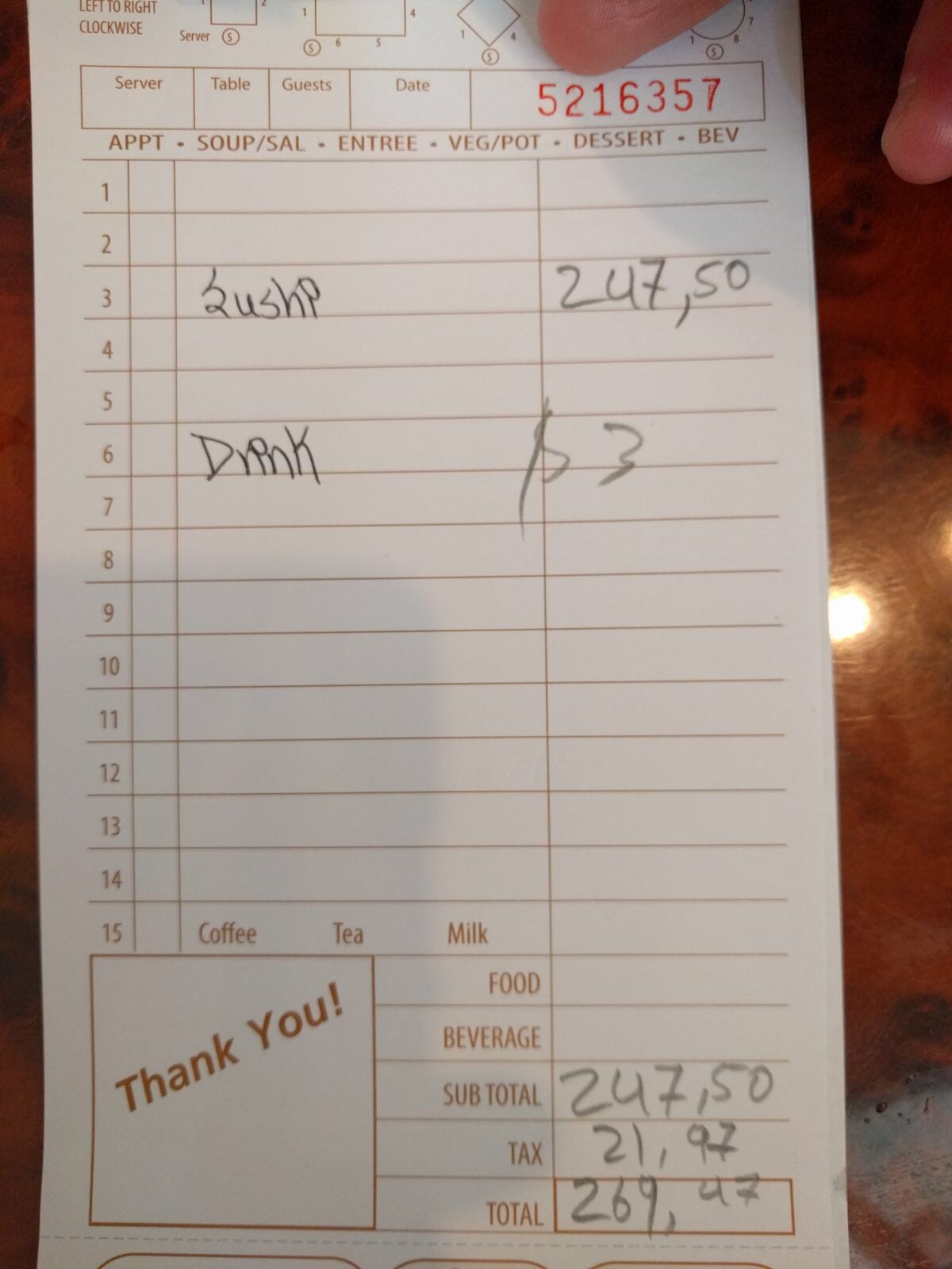 We had 3 people eating 3 small plates of sushi and ended up paying nearly $300 for LUNCH!!! Immediately after sitting down the waiter brought out a $60 round of tuna. Had we known, or had we even been asked, about this "Chef's Special" value, we wouldn't have taken part. So, before course #2 we asked how much these tasty little morsels cost. The waiter explained that a full ten-course tasting of the Chef's Special usually costs around $100/person. So, we decided to stop at course #3, under the impression that each dish costs around $10/person. We were misled. After seeing the outrageously overpriced bill (gratuity included, which our waiter also failed to mention), we spent a good half hour pondering how we'd run up these numbers, including several items the waiter charged us for that we hadn't even eaten!!! He had to personally check his math in front of us several times! In the end we were still charged for $247 plus tax, for 18 pieces of sushi...