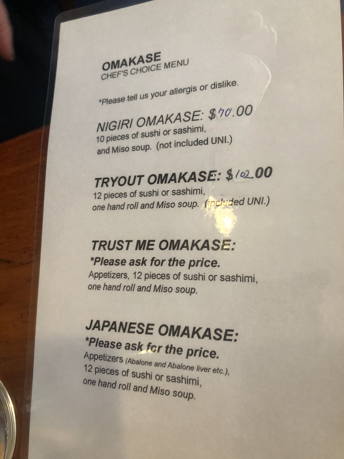 Read moreit's almost military style and i was almost afraid to answer my phone by the pieces of sushi and sashimi melted in my mouth. for months after i couldn't have sushi any place else. this place ruins you for all other raw fish. NO menu. NO spicy tuna, No california rolls, and that's just fine. you're allowed to state your food limitations and then just be surprised. it's a price raw indulgence but every bite is worth it. you dip the pieces you're told into the accompanying soy sauce and some you don't but you know you've never had fish like this before and you didn't even know it comes so fresh. they serve only what was fresh in the market that day and if it wasn't there you can't have it. they don't give you a fish and tell you it's tuna just because you ordered tuna, like most other sushi places in the city (even the best ones). you probably didn't know that goes on, but yes. so if you're a raw fish lover and you can splurge, this is the place and now is the time. go and enjoy but be forewarned that it WILL ruin you for other place and you may regret it, but in the best possible way. you'll finally know what real sushi / sashimi was always...