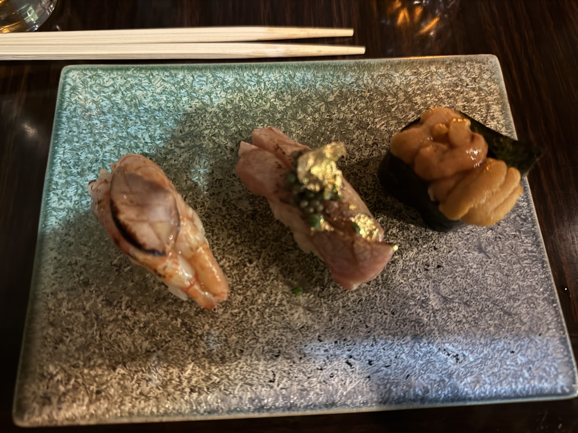 Appetizer: Hokkaido sea scallop with uni, paragon truffle, and uni miso Appetizer: Smoked king fish Nigiri: Kampachi amberjack with pickled jalapeno Nigiri: Sea bream, plum paste, shiso flower Nigiri: Striped jack with pico de gallo Nigiri: Seared yellowtail with shishito pepper Nigiri: Seared lobster, shiso leaf tempura, Mira Nigiri: Seared trout with tomato confit Nigiri: Toro with French truffle Donburi: Toro donburi with uni, forbidden rice, soy sauce marinated salmon egg Dessert: Yuzu panna cotta with raspberry glaze and raspberry bits...