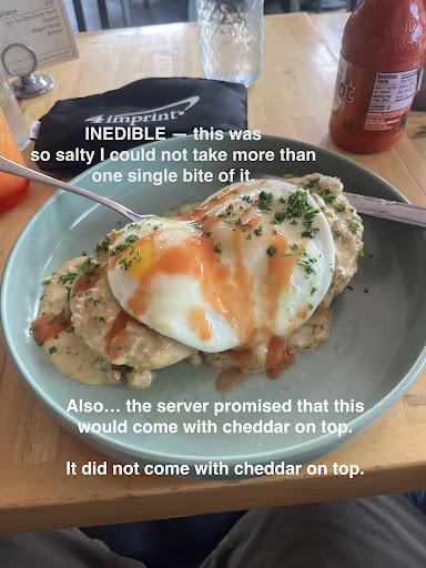 Then I tasted the food, and I knew we had royally screwed up by choosing Sweet Chick. The biscuits and gravy were so salty that I only had two bites. The breakfast burrito, on the other hand, was so devoid of flavor that it too was inedible. The restaurant’s staff took away both uneaten plates without questioning if there was an issue, and didn't give us an opportunity to raise any issues.