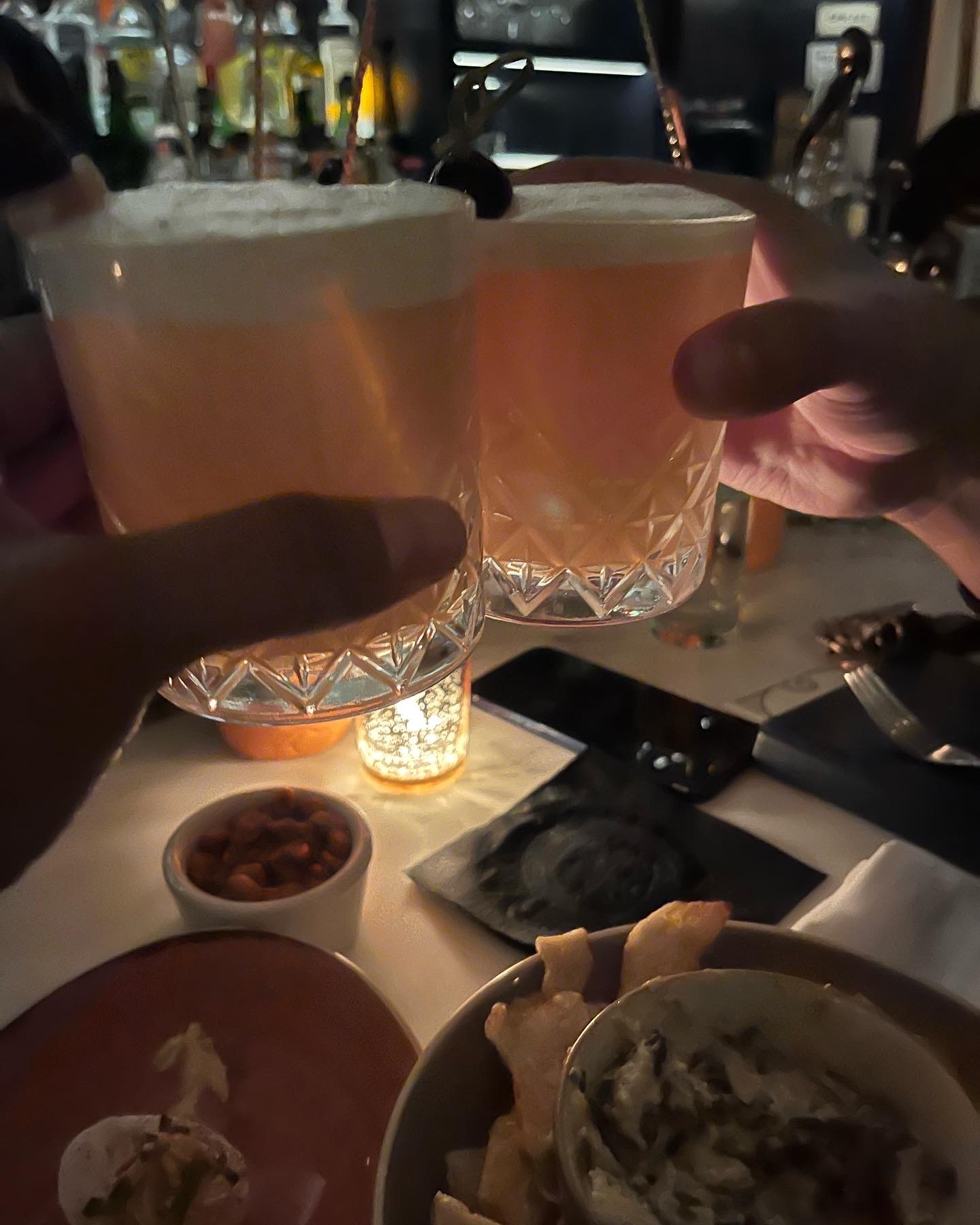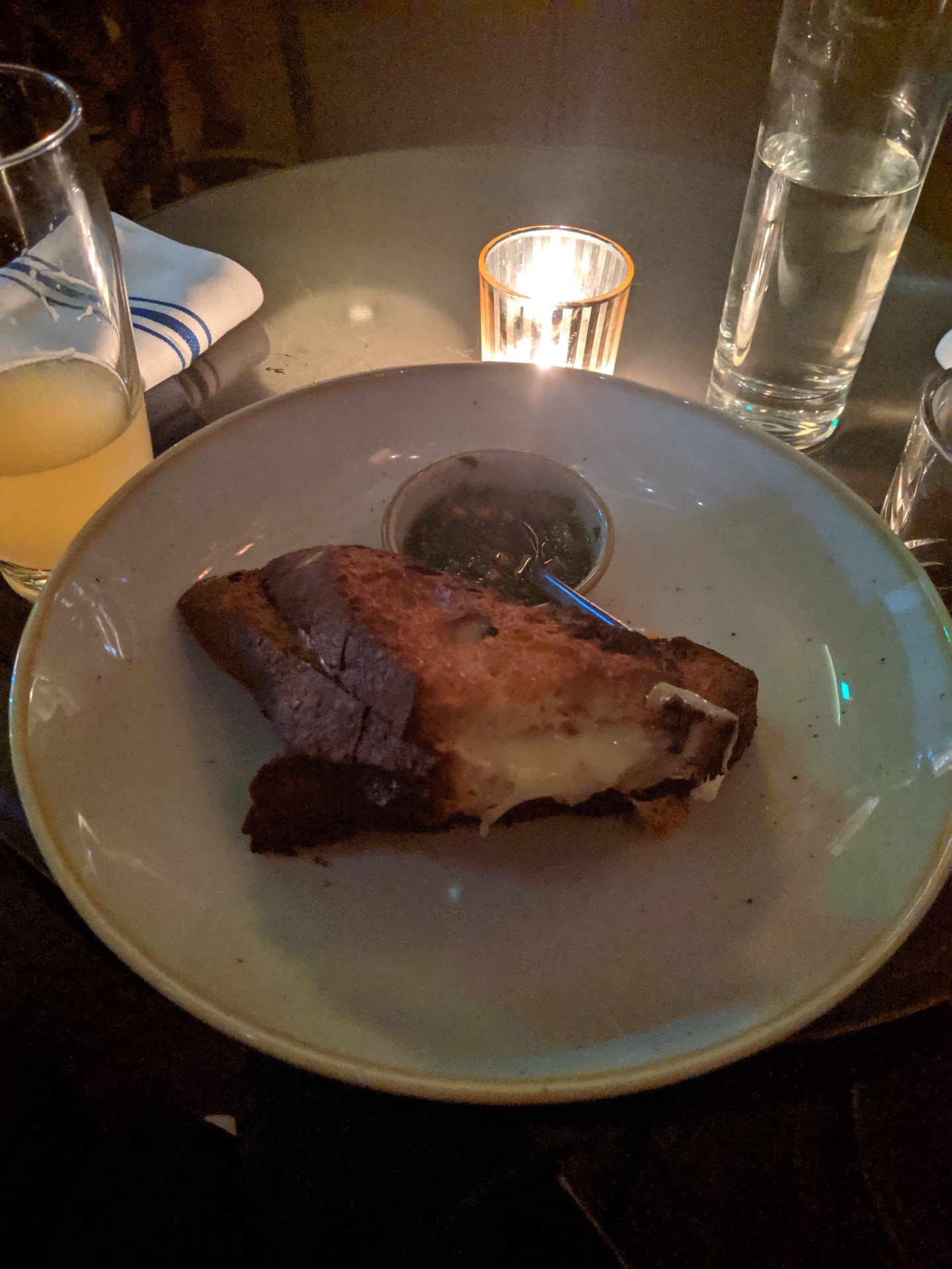 I have a very good friend who's been telling me about this place since I met her. It's her favorite place for number of different reasons. We only ate a little bit we had these incredible pickled eggs that are very small and they're and pickled in beet juice. Are topped with an amazing sea salt it's a very very interesting flavor something I really think anybody that can get to this place should try. The other item we shared was a grilled cheese sandwich with tomato bisque both of which were surprisingly tasty for something as simple as a comfort food such as that combination. I commented to my partner that the only time I see that on the menu is at a traditional Diner which anybody who read my reviews knows I'm a big fan of traditional diners however this is a different rest on it and the cheese and bread are fabulous and the soup the bisque really is super duper sick . These were really really great items . The cocktails are very fancy and original and I tried two different ones can't remember what they're called but they were both very different. We sat outside but I did manage to make it into the dining room to check it out and it's very sleek. There's some very interesting art including a rendering of the Hieronymous Bosch triptych from the what they believe is around the year 1500 called The Garden of Earthly Delights. Just like the original which is in The Prado in Madrid it is painted on three wooden panels and I'll bet you just bet you they're the exact same size. I remember seeing this painting when I was last in Spain and it's very memorable. Look it up if you haven't seen it before. It's worth it to go into this place just to see this painting however I would highly recommend you have at least a cocktail while you're there...