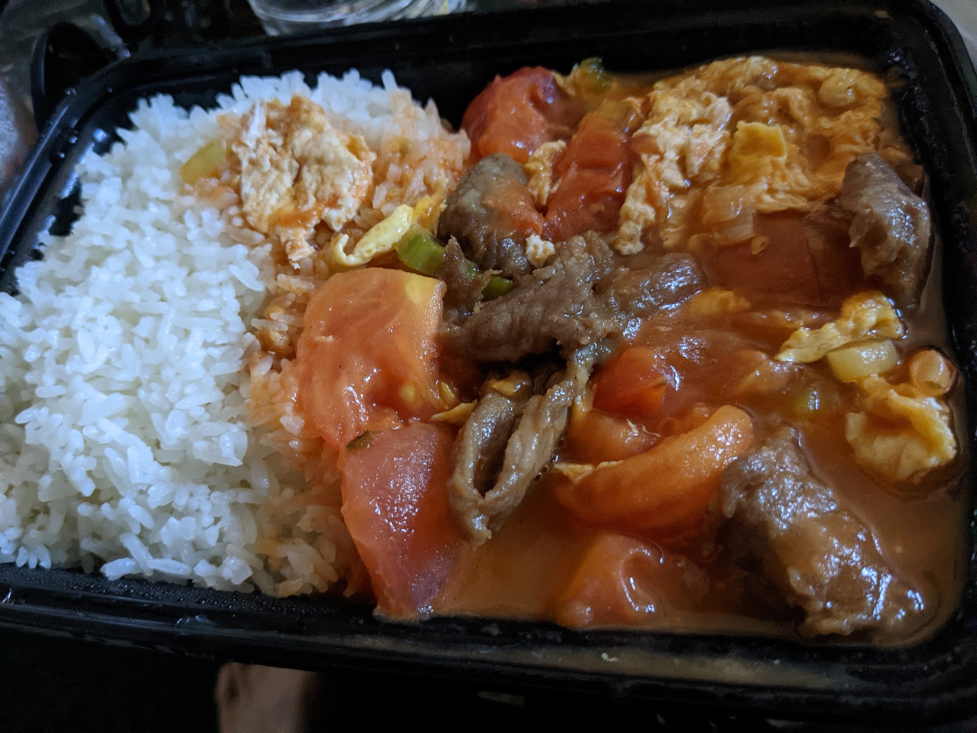 The tofu veggie dish is so good, satisfying, umami. It has thin potato slices! (more filling) Wood ear! (also more filling) Plus the usual veggies and yummy triangular tofu. Such a good plant-based, vegetarian, meal that can be stretched into two meals for two (No cooking for a day!). Good for after a workout, or physical labor, or a lot of mental-emotional activity.