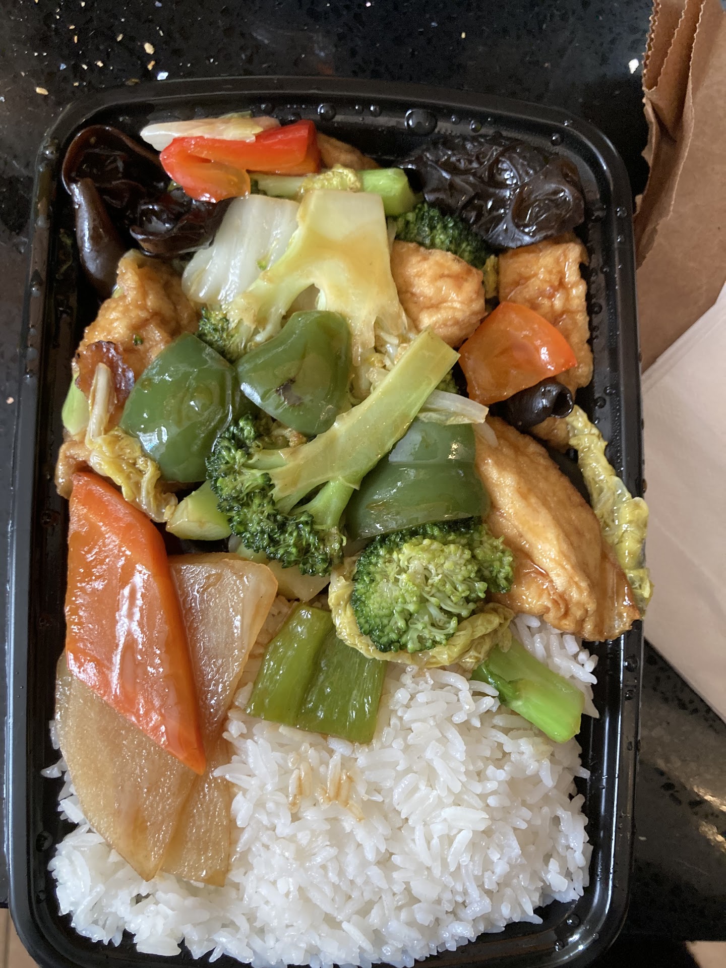 豆腐蔬菜菜非常好,令人满意,鲜味十足。它有薄土豆片!(更饱腹)木耳!(也更饱腹)加上常见的蔬菜和美味的三角豆腐。如此美味的植物性素食餐,可以延长为两顿双人餐(一天不用做饭!)。适合在锻炼、体力劳动或大量精神情绪活动后享用。