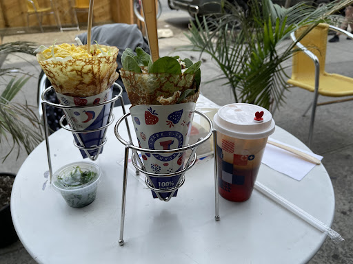 Read moreI always enjoy whichever ginormous sweet crepe I order here: 5/5. However, quality of service: 2/5. I haven't been here since pre-pandemic. There is a kiosk now; fine. Placed my order and it asks for your name and cell# so they can text you when your order is ready; fine. Today there was probably 6 people on duty.. noone acknowledges, let alone, greets you. I went back to my car bc my meter was up after 10 min. I ended up waiting 30 min for just 2 crepes. I walked back and my order had been sitting there. I informed them that their own kiosk says they'd text me but didn't.. And I just got a blank look. Then, they tried to only give me one free boba tea when their promo gives me two. Again, blank look. I had to tell them to give me the 2nd. Parking is difficult around here so the lack of concern for service was really...