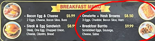 I called to order the menu item “Omelette + Hash Browns” which says it comes with 3 eggs, cheddar, bacon slice, and ham. It seemed like he needed to consult a menu to even know what I was talking about, but eventually he did repeat the word omelette and the ingredients back to me. I told him I didn’t want bacon, I just wanted the ham. He seemed weirdly surprised and confused that I would want ham, but I placed the order along with a breakfast burrito for my partner. Then the guy just hung up on me without saying how long it would be or anything.