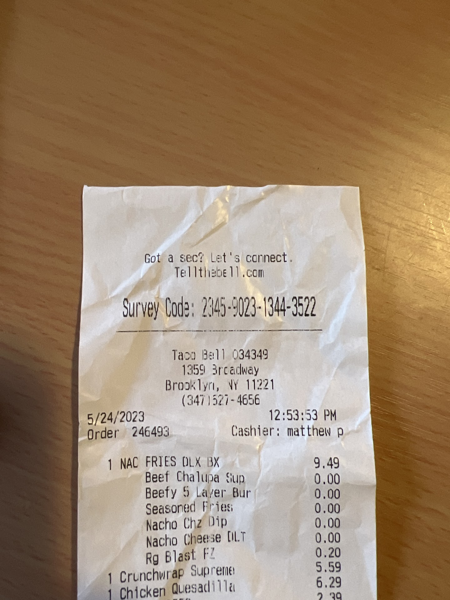 Read moreAfter being brainwashed from seeing all those $5 Taco Bell snack box commercials when I was down South and hearing that there was a new location in Brooklyn. I had to check it out. The location is new and everything is clean and well situated. Unfortunately, they did not have the special, it was over $6, and change, for a limited time. But my curiosity got the best of me, so I bought a Steak nacho box and a Chicken nacho box. It was a lot of food, so that was good, couldn't eat a box in one sitting. Neither of us could. It comes w a medium drink that can be filled up at a side drink station. Trying to cut down on soda, I opted for a sweet tea and there was no sugar in it and it tasted like dirt, somehow someone mixed up the drinks because u had the option for either in the same canteen. Being able to have another Taco Bell location in Brooklyn that is an upgrade from the last is why it gets the rating, but if another location opens up that honors the TV specials, I'd have to...