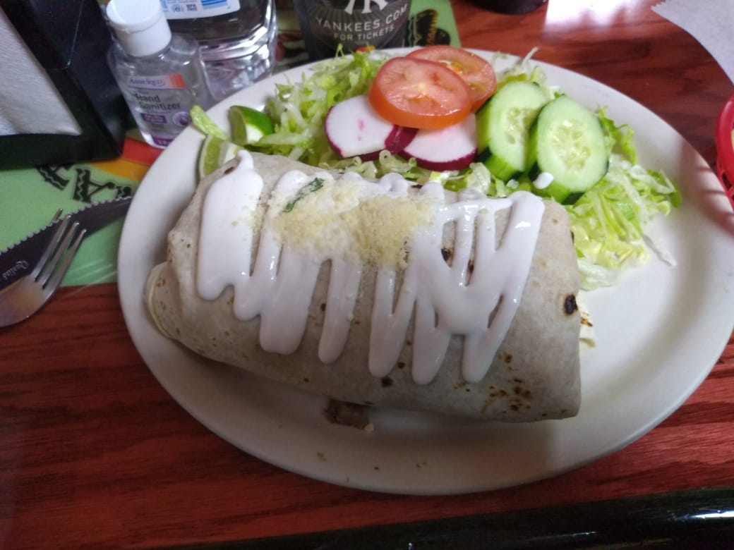 -=-Chorizo and Egg, Wet Burrito-=- $9.75. I ordered this off the menu as a custom request. The chorizo wasn't oily at all like it is at most places. One thing that was immediately apparent to me was that the chorizo was cooked similarly to a hot dog then diced. I'm used to seeing it squeezed out and fried on a pan. It wasn't too eggy either. The big kicker here is the wet part: smothered in sour cream and parmesan cheese. Yes I had to eat it with a fork, but it was tasty with the green and red salsas.