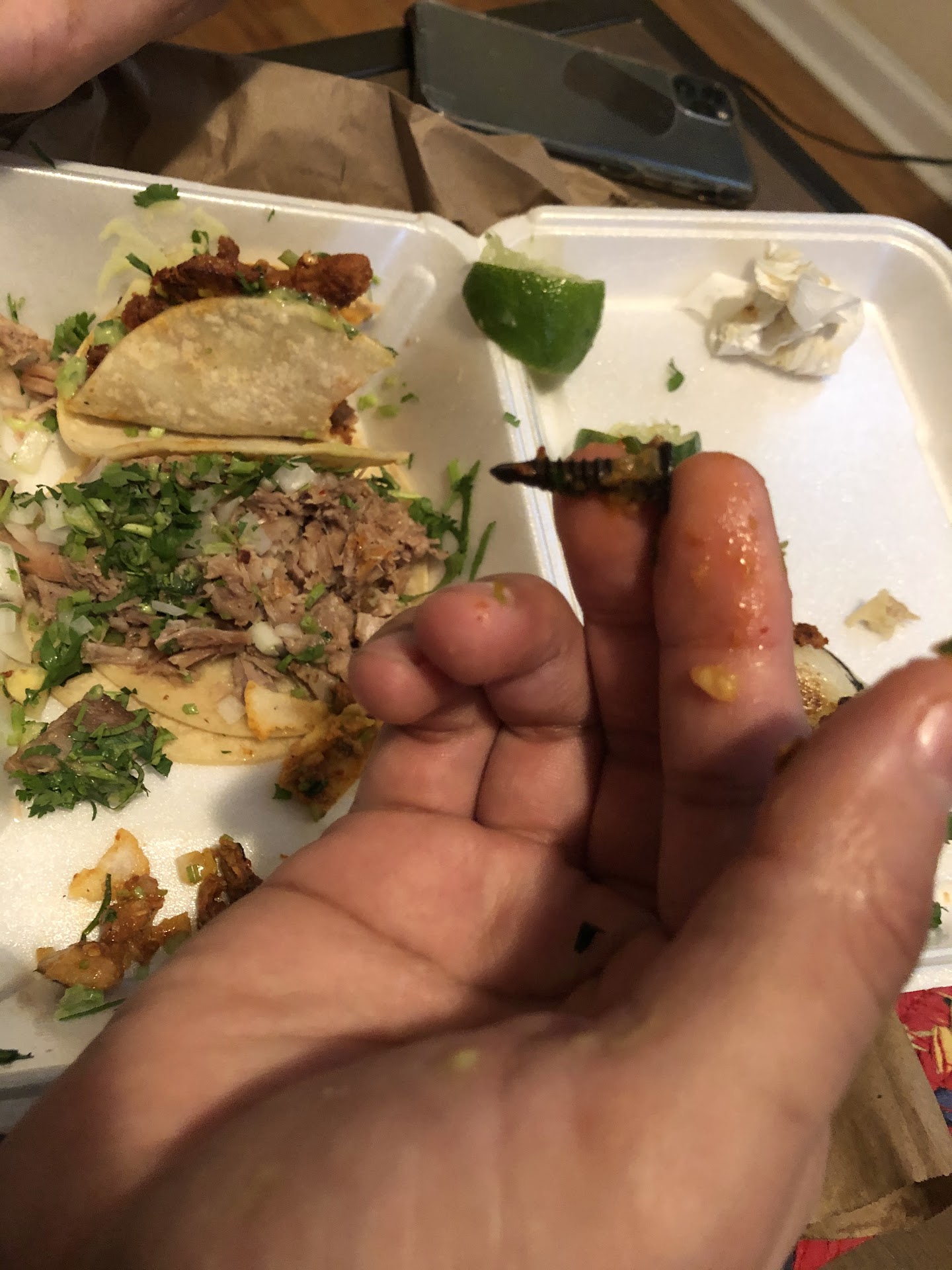 I know we’re grabbing food from a food truck, but this quite the surprise we got in our taco al pastor 😖- a SCREW! Typically food is bomb, but this has never happened...