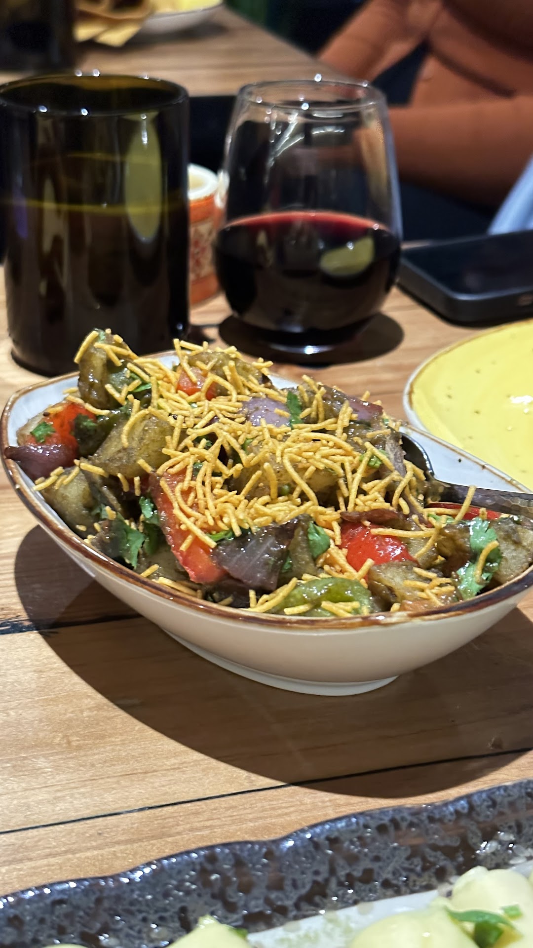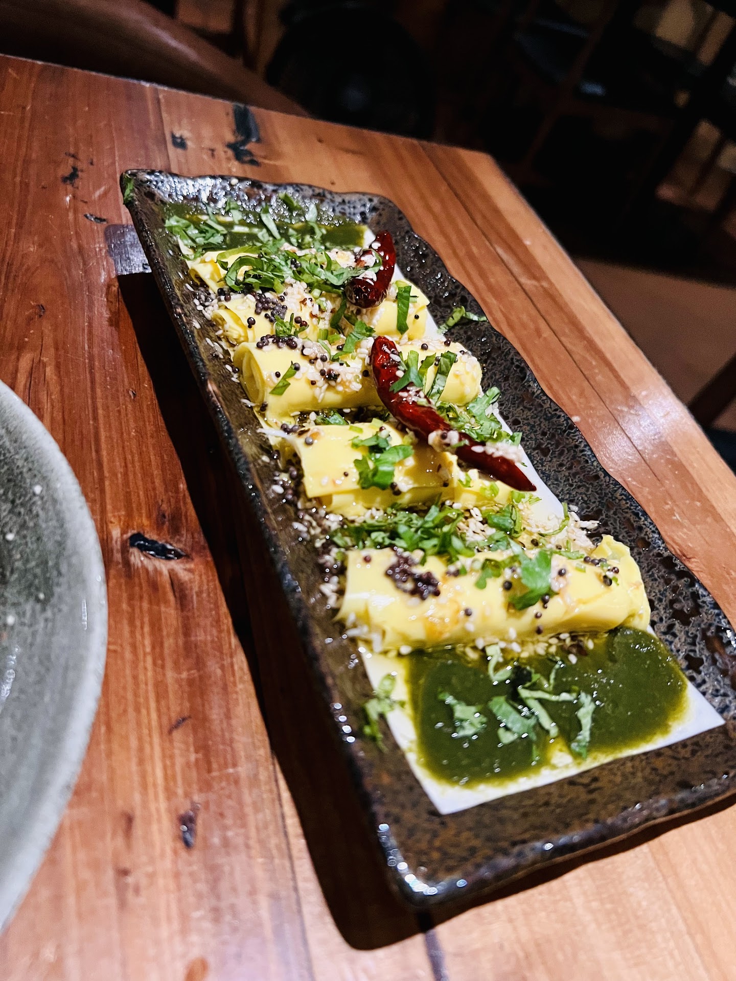 The servers are also very pleasant & describe the menu well. Being an Indian myself, I didn’t quite need a description as menu items like Khandvi, Chaat, Sabudana vada just gushed in a sense of nostalgia from my home. We ended up ordering Khandvi, Aloo Chaat, Veg Biryani, Saag Paneer, Roohafza Spritz & some wine.