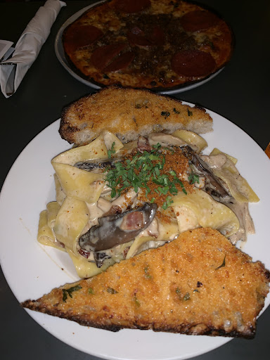 Read moreMaybe I should have just stuck the pizza. Judging by the reviews and all the people at my table who ordered pizza, everyone enjoyed it. I decided to be different and order pasta because the Pappardelle in Carbonara Sauce sounded really good. It was Pappardelle tossed in homemade carbonara sauce made with bacon and pulled chicken white meat, shiitake and portobello mushrooms, white wine and cream. In theory, it sounds good - I love pappardelle and carbonara. Sadly, it did not taste good. The chicken tasted like leftover chicken, and there was no flavor to the dish. I had to keep adding salt and red pepper flakes. At least the pasta was al dente and the garlic bread it was served with was good (albeit a bit oily). The drinks are not any better. The aperol spritz here isn't very good - pretty sure it's just aperol and seltzer, and the wine is pretty terrible. I tried a sip of the pinot noir my friend ordered and we both agreed it tasted like the three buck chuck from Trader Joe's, except it was 4x the price for a glass, and was served in a water cup.