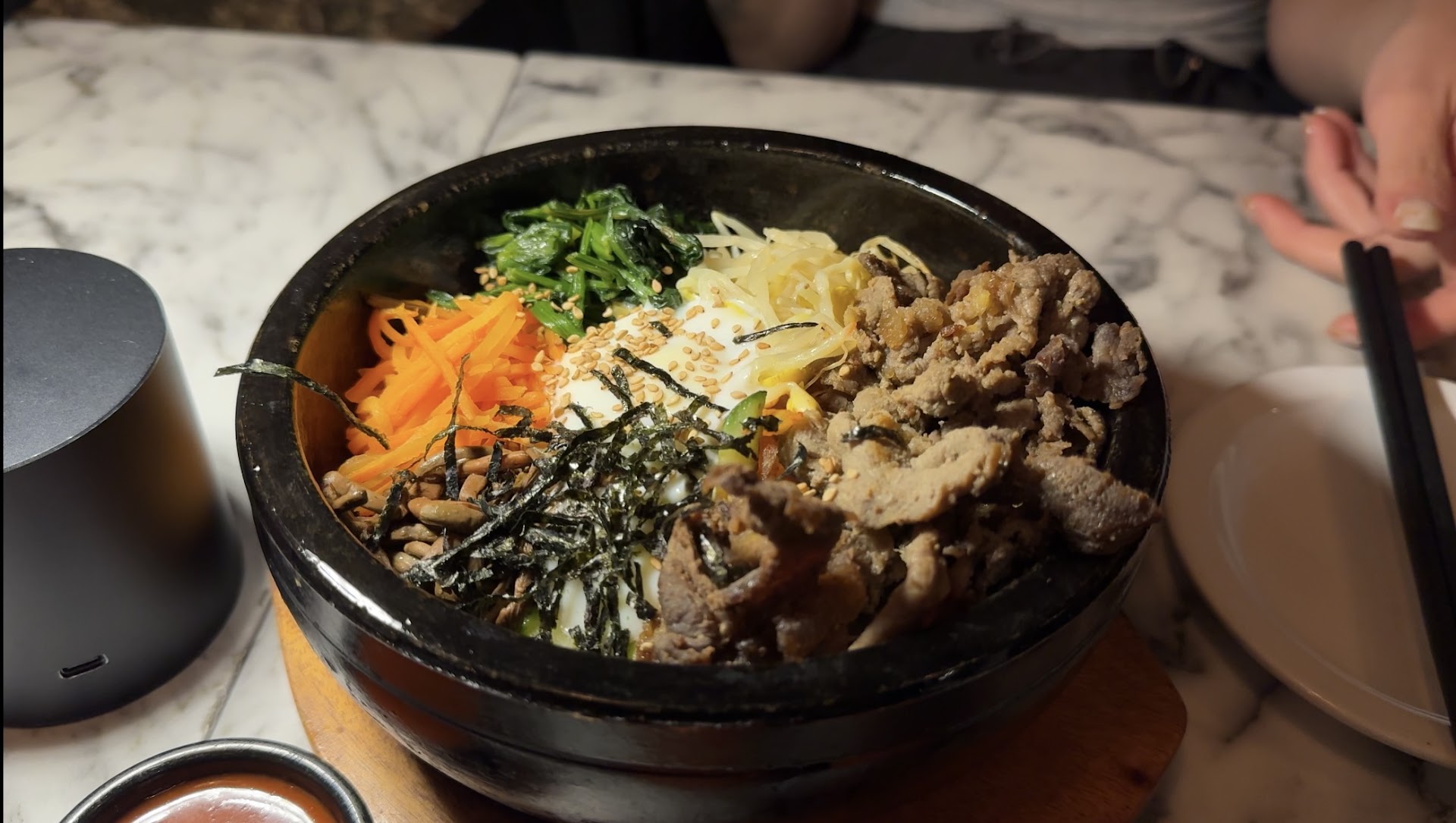 As for the food, it was absolutely delicious. I ordered the hot stone bibimbap, which was served in a hot stone bowl and filled with perfectly cooked vegetables and meat, topped with a perfectly fried egg. The flavors were vibrant and well-balanced, and I appreciated the attention to detail in the presentation.