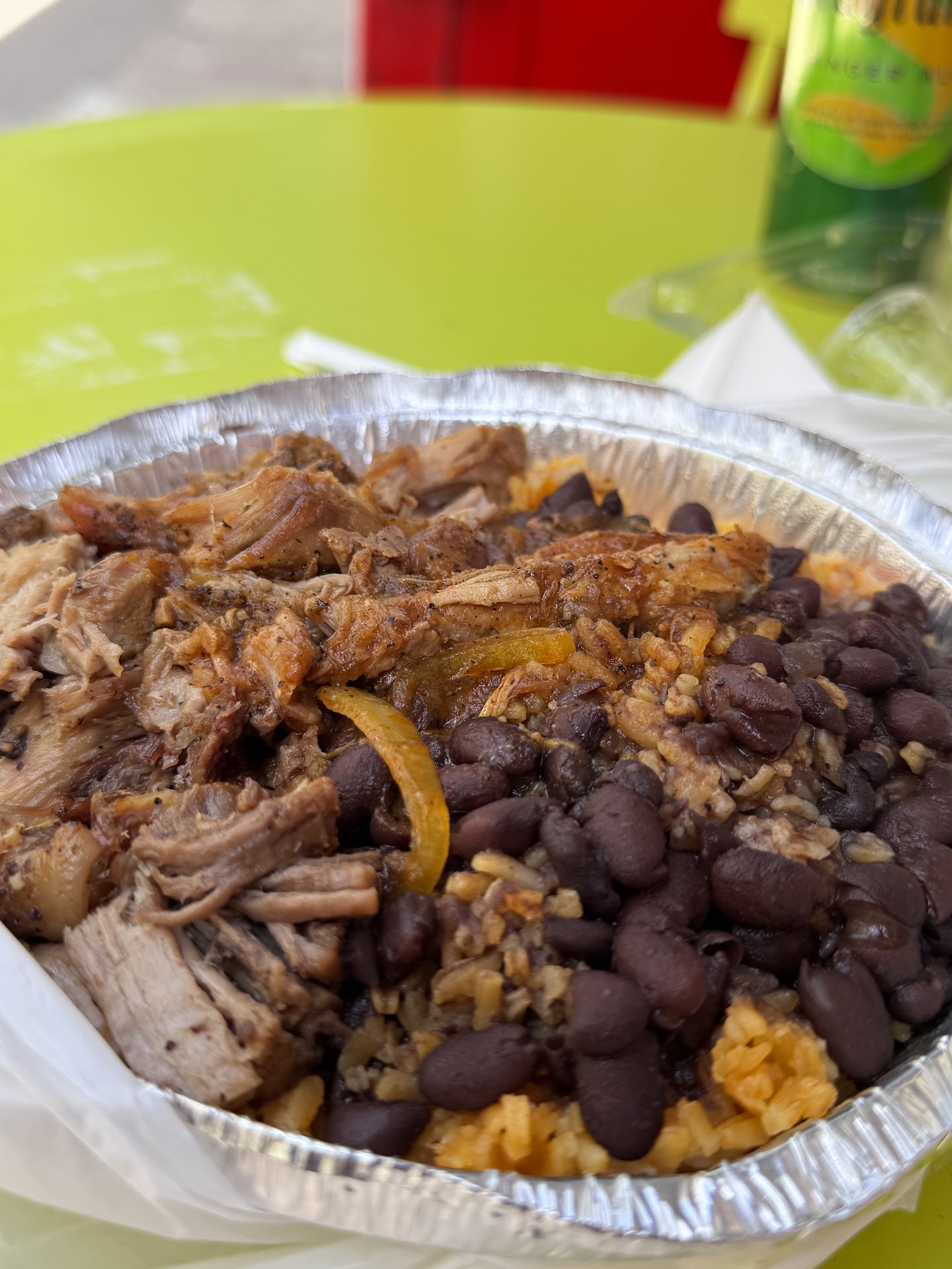 While exploring this area, I stumbled upon a modest Dominican eatery. I ordered the pernil with rice and beans, accompanied by a side salad and a canned soda, totaling $20.