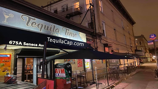 Tequila Time Bar Cafe offers a lively and affordable cantina experience in Ridgewood, Queens. Located in a weathered storefront building along Seneca Avenue, the interior decor evokes a rustic Mexican cantina with dark wood furniture, cowboy-style swing chairs along the bar, colorful glass lanterns, and vibrant Mexican artworks on exposed brick walls.
