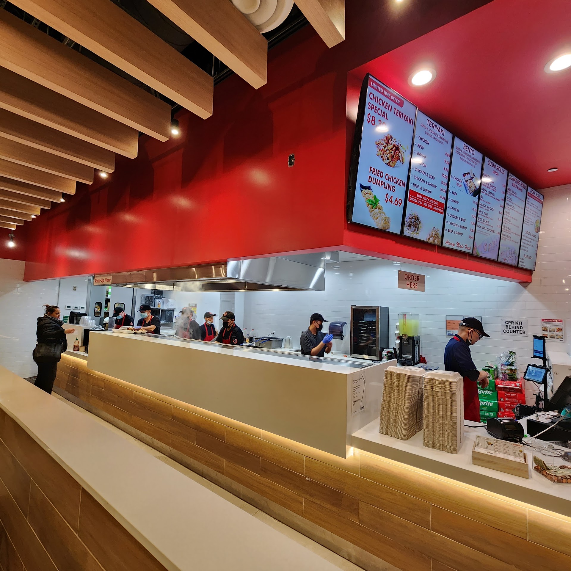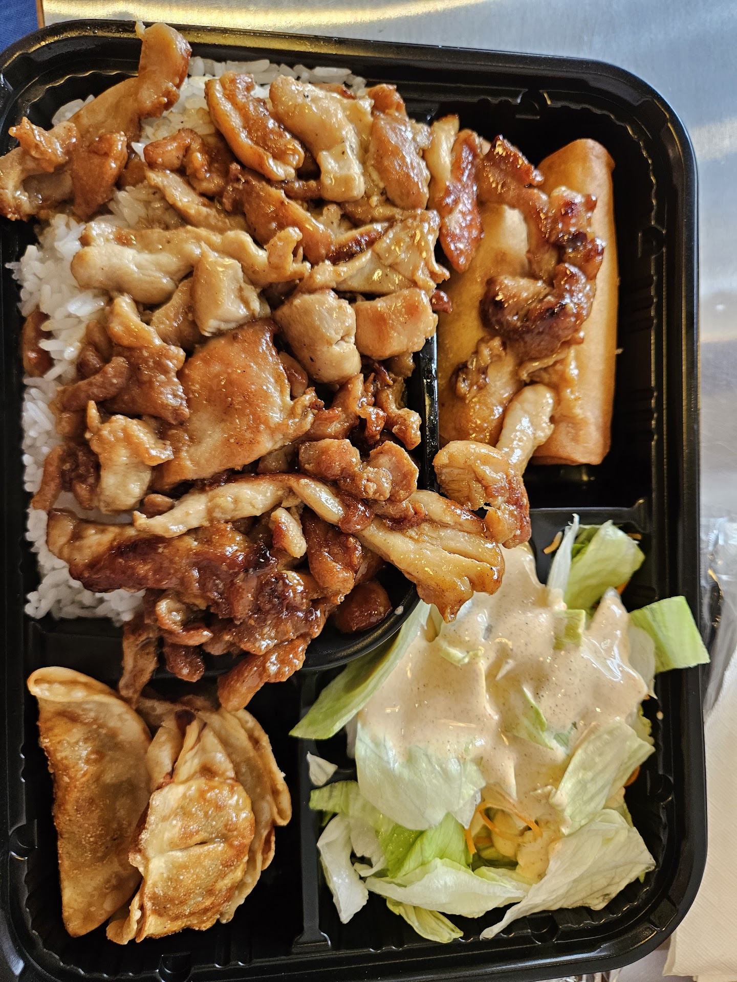 I had chicken teriyaki bento at $9.99. It wasn't expensive but food overall was terrible. Inexpensive food doesn't need to be terrible. Rice was stuck to each other (cooked rice does that when it's cooked long time before serving). Spring roll was thick with flour. Dumpling was soaked in oil. Overall, low quality food; they seem to try to make up with quantity. I won't need that much rice (especially when it's not tasty) or two pieces of dumpling and spring roll. One dumpling and one spring roll at a higher quality is preferred. Iceberg salad was so and so. For the chicken and source, i am giving one star. Their bathroom had dirty floor, water (or urine?) around the rim of toilet seat and no toilet paper and smelly. I don't want to...