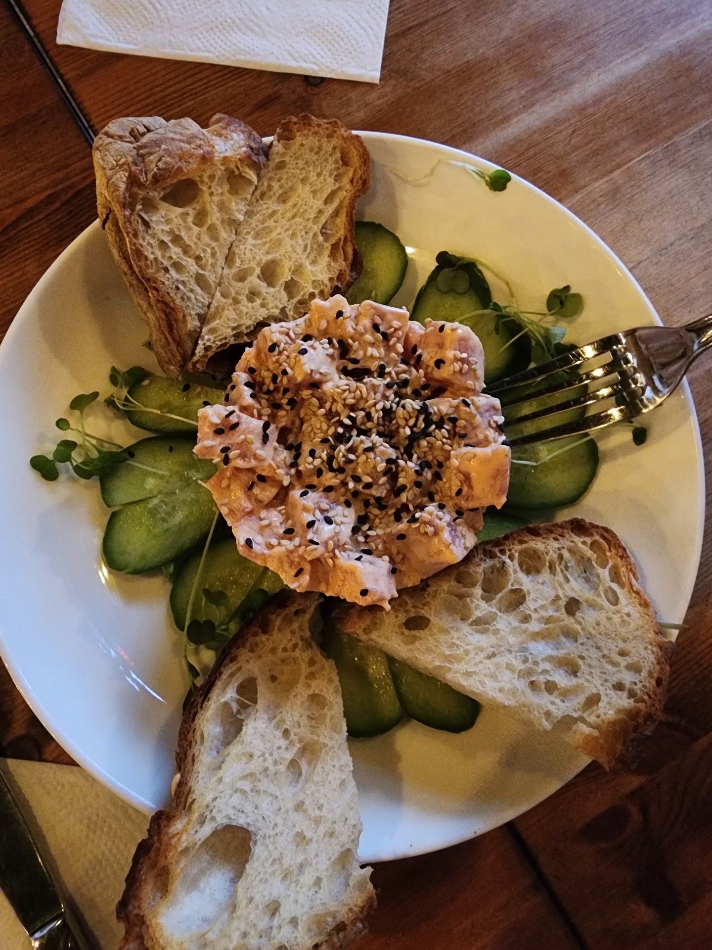 The steak salad with arugula was passable, but it lacked the finesse and flavor that could have made it outstanding. Furthermore, I would advise against ordering the oat latte, as it was simply disgusting.