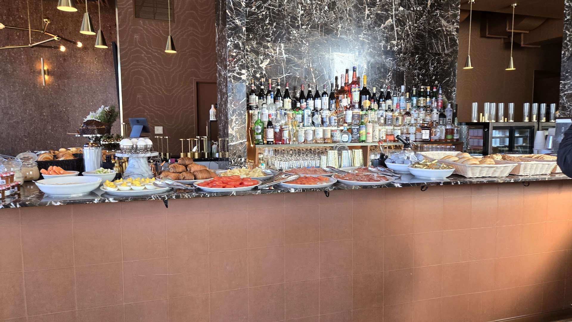 As for the food, the overall quality was good, and there were plenty of options to choose from. I enjoyed the sausages, egg dishes (boiled eggs, small omelets, scrambled eggs), and breads. The prosciutto and smoked salmon were especially fresh and flavorful. For dessert, I tried yogurt and fruit, which were excellent. However, the donut-like dessert (resembling a cream-filled munchkin) was very dry and disappointing.