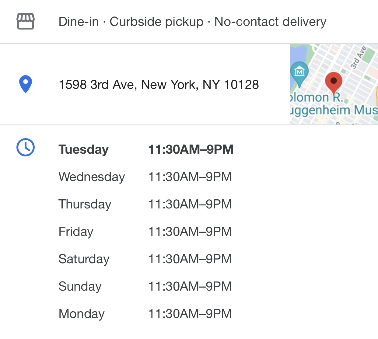 Read moreI called to order at 8:45pm on Monday evening. I was walking by and planned to pick up the order. I was told by the person who answered the phone that the kitchen closed at 8:45pm. I said that their website said they close at 9:00pm. The man then told me the kitchen closes at 8:45 and the restaurant closes at 9:00pm which I told him should be stated on the website and paper menus. He said he would let someone know and hung up. I then walked by as the employees were throwing on their coats and running out the door. I worked in the restaurant industry in NYC for13 years. This is not the way to foster return clientele and keep a restaurant open. Never going there again. Bad customer service. If you stop taking orders at 8:45pm then post that. I ended up at Korali Greek restaurant a few blocks away at 8:50pm where they took my order even though they close at 9:00pm. Got great food by 9:00pm and went...