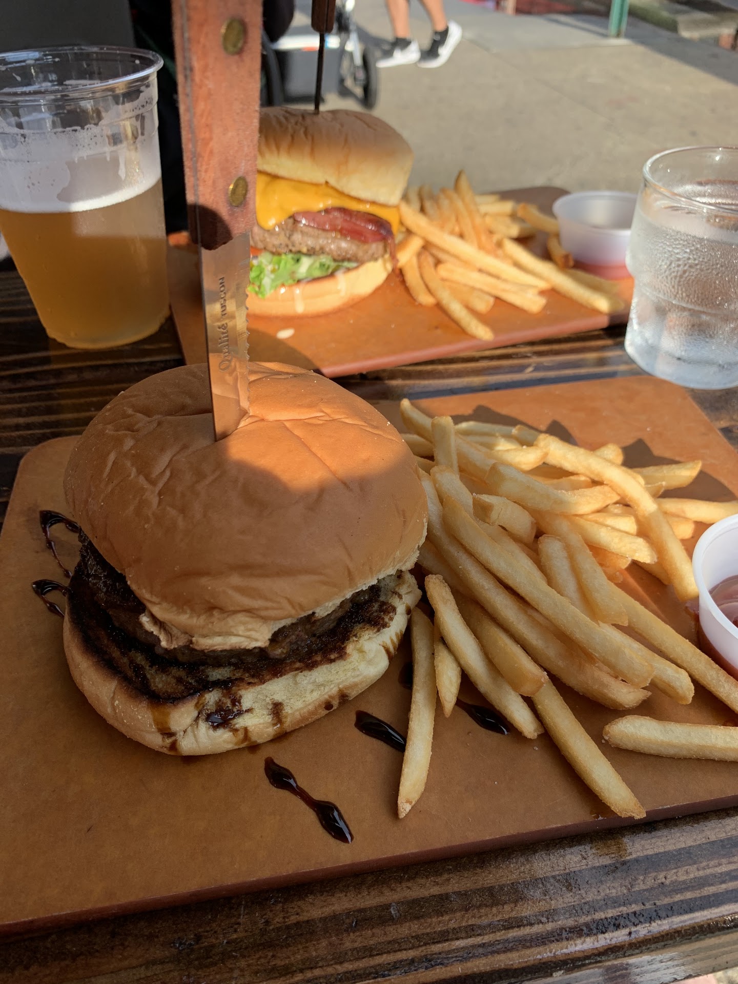 First of all, the burgers were fine - not amazing, but I live in Portland OR where there are tons of unique burger-and-beer places of similar quality. But never have I seen the kind of douchey attitude that was on display in this restaurant. We couldn't stop talking about it. The bartender (owner?) must be one severely butt-hurt dude. Upon sitting down, my girlfriend and I were looking over the menu; it was hot out and we asked for water before deciding on drinks. The bartender said "there's water over there, it'll be faster if you get it yourself." Now, this is a normal thing where I come from, but that's not the right way to explain it. You know pal, you can make tips faster if you get stuff for your customers rather than standing there dispensing your arrogant opinions.