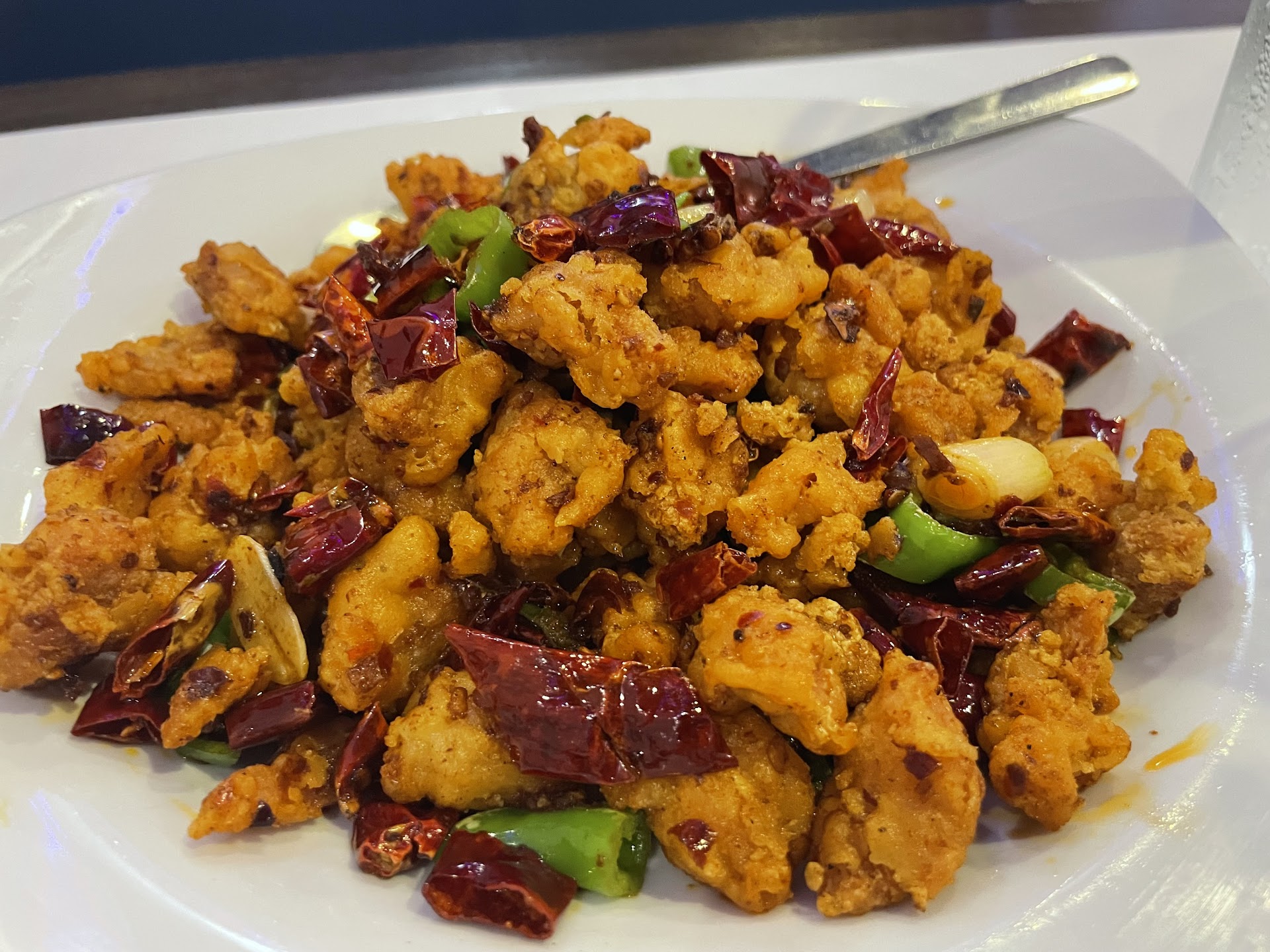 辣子鸡 - Crunch bites of chicken akin to Popcorn Chicken, if Popcorn Chicken was also beautifully spicy and flavorful after being tossed with a combination of dried red chilis and fresh green ones. Bits of onion and garlic round out the spicy flavor with mellower more subtle flavors that combine together well.